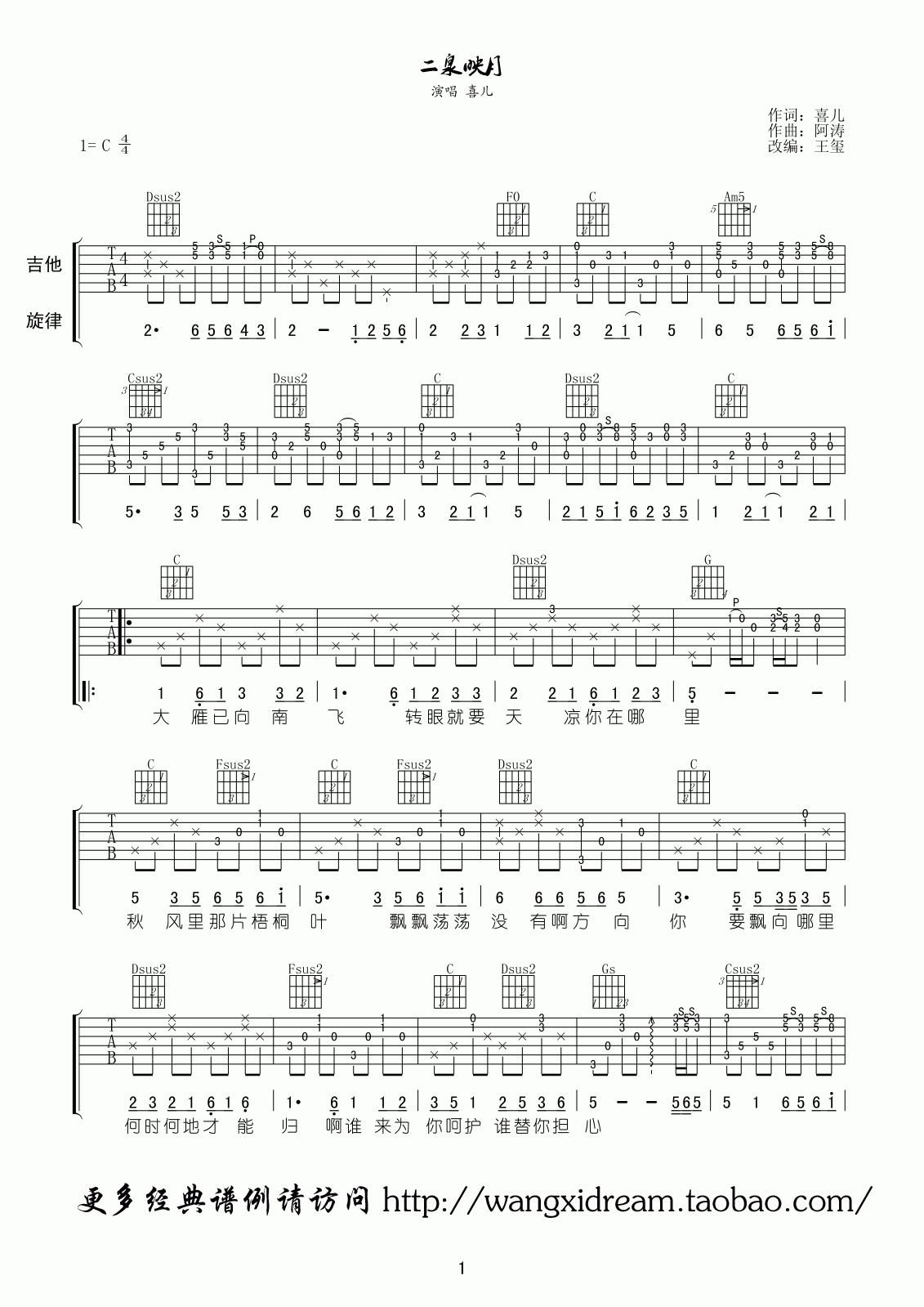 《二泉映月》吉他谱,采用C调指法编配,共有2张高清图谱,免翻页排版设计。...