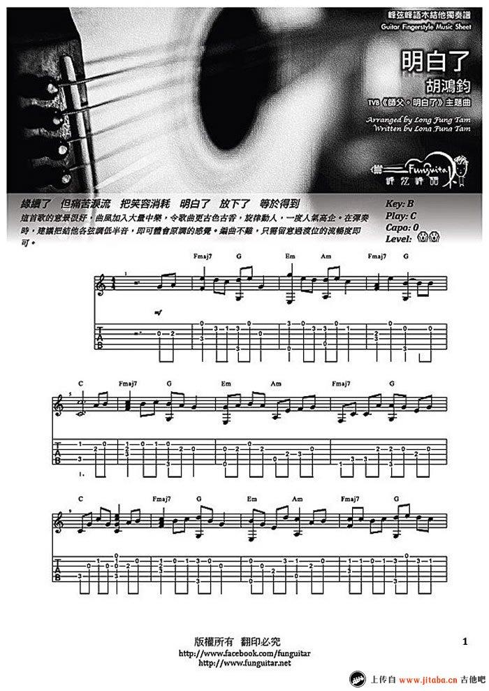 胡鸿钧《明白了》吉他谱,采用C调指法编配,共有2张高清图谱,免翻页排版设计。...