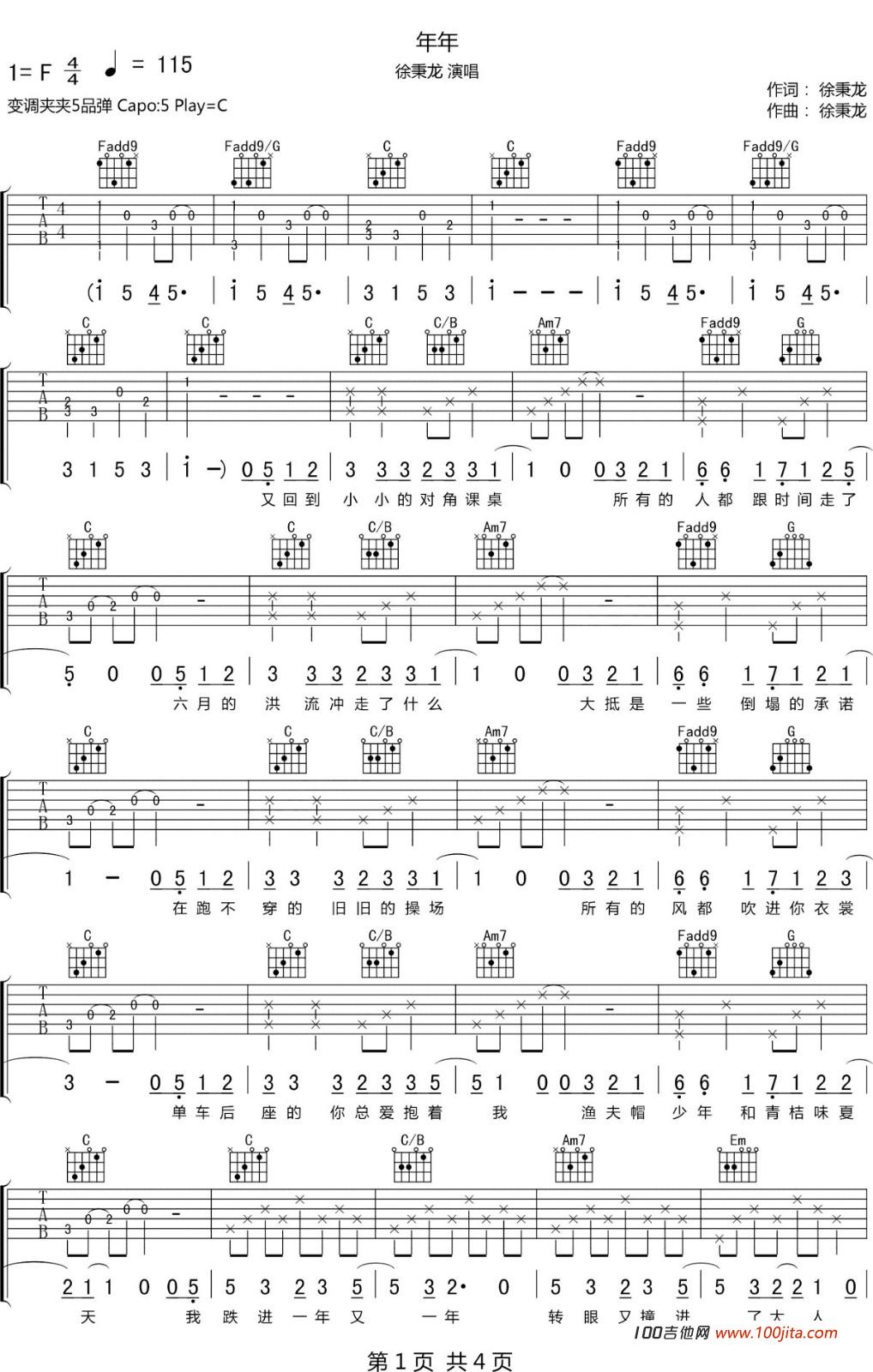 吉他<<年年>>吉他谱_徐秉龙