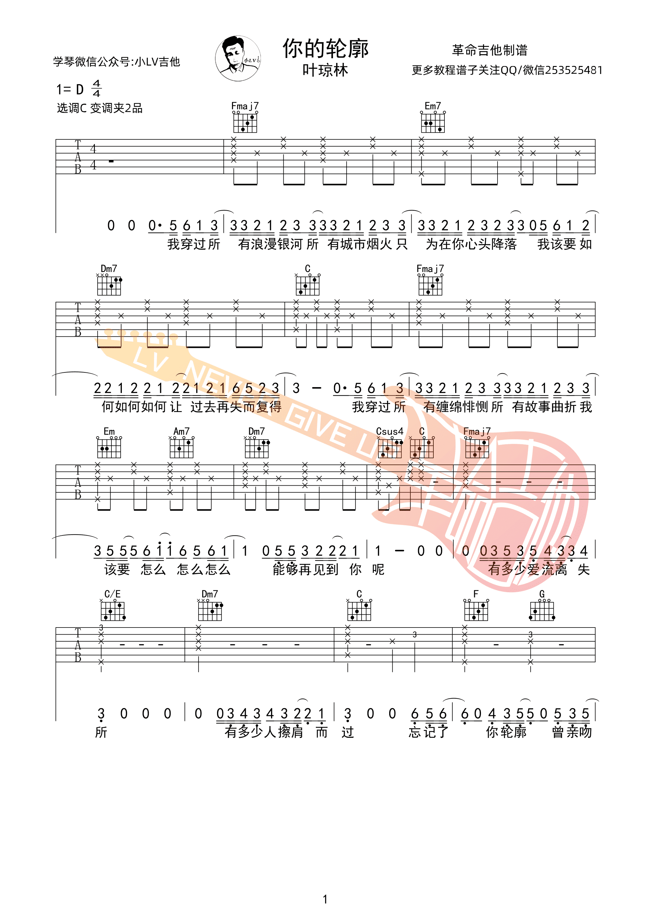 吉他叶琼琳 - 你的轮廓 吉他谱-C调吉他弹唱谱