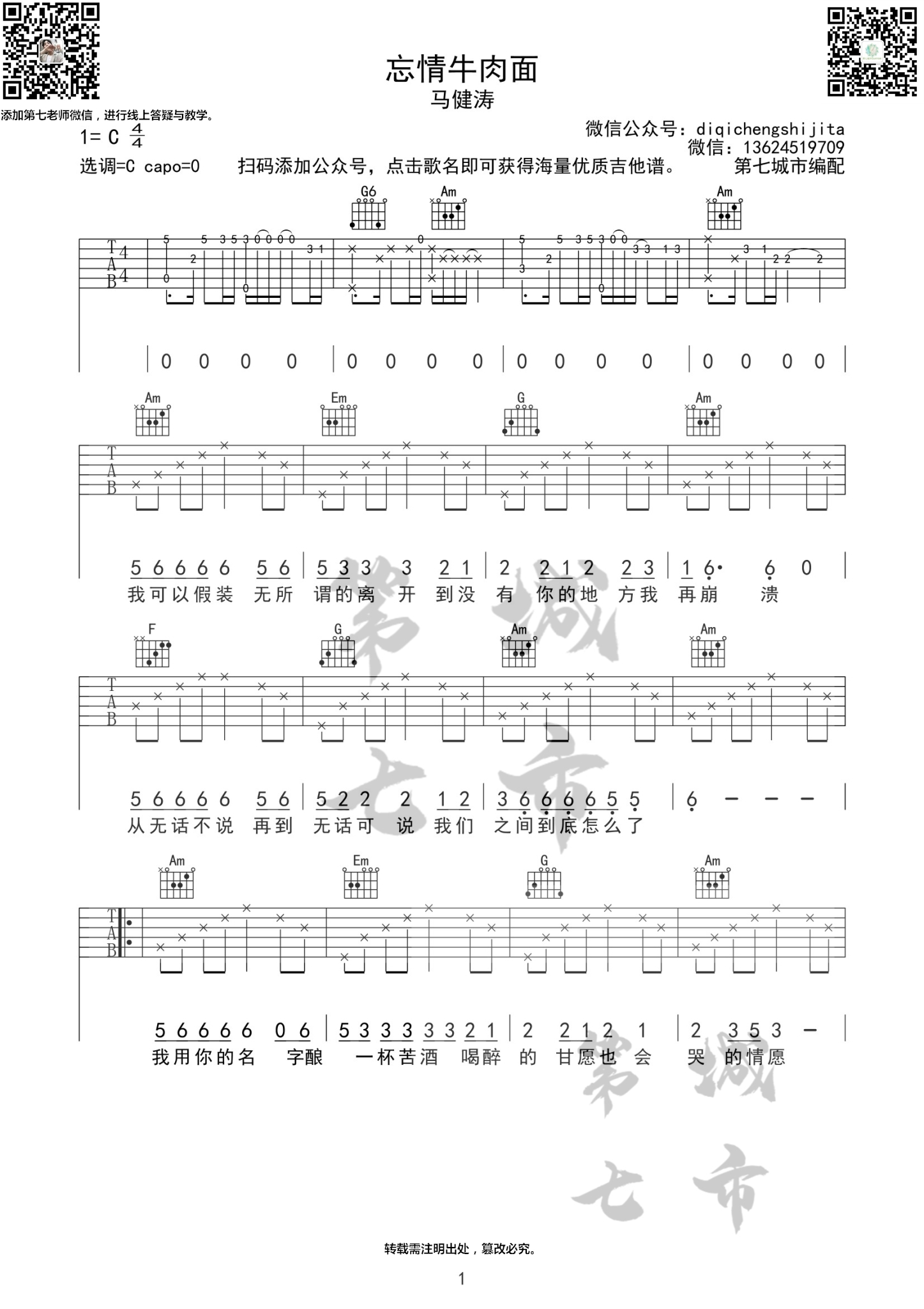吉他忘情牛肉面 马健涛 吉他谱
