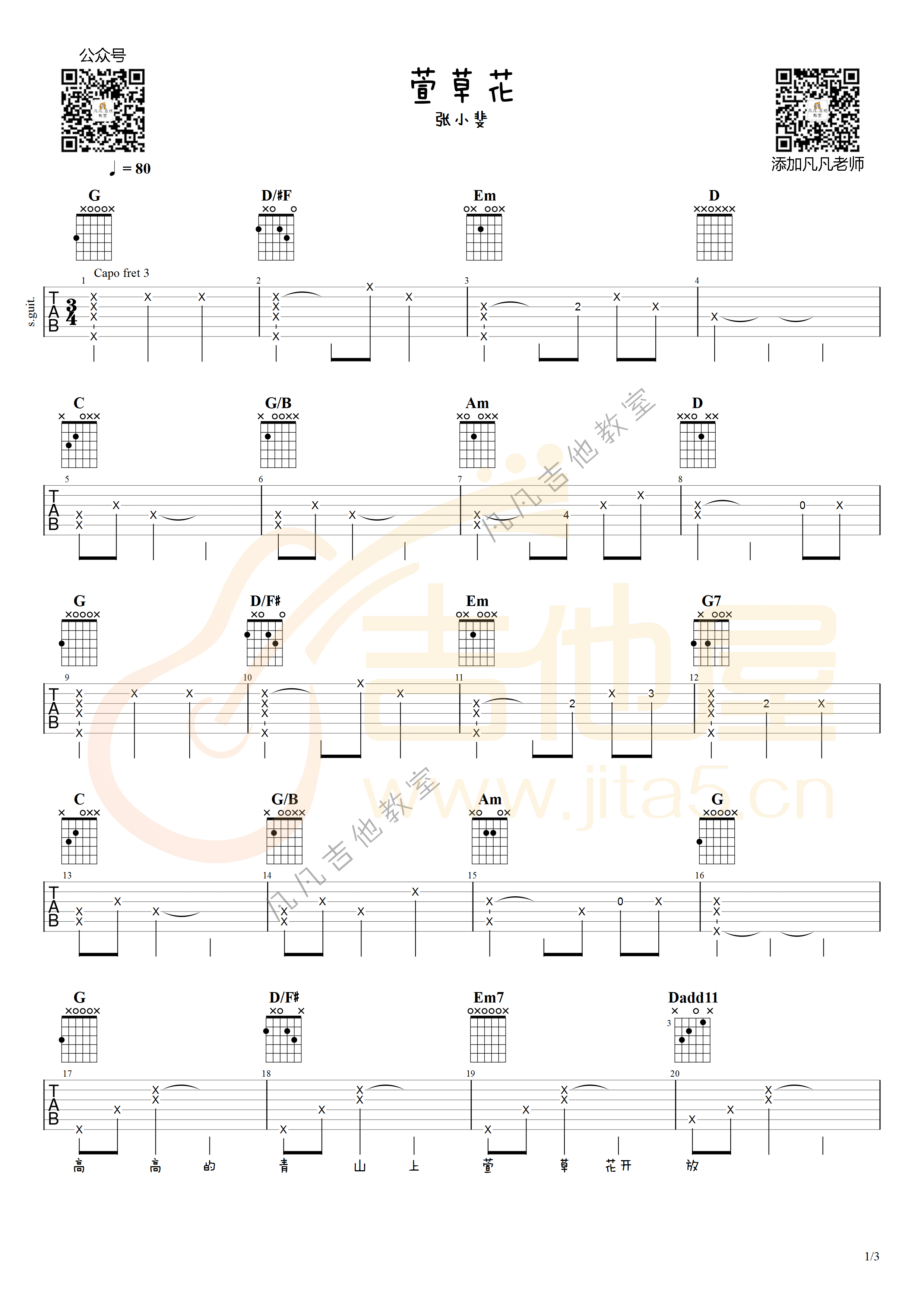吉他萱草花吉他谱_张小斐_《萱草花》G调弹唱六线谱