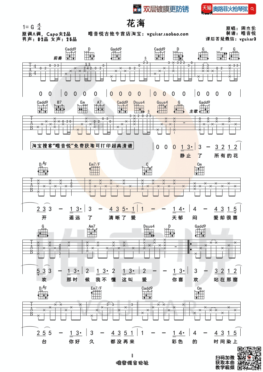周杰伦-花海吉他谱弹唱谱-简单版吉他弹唱扫弦...