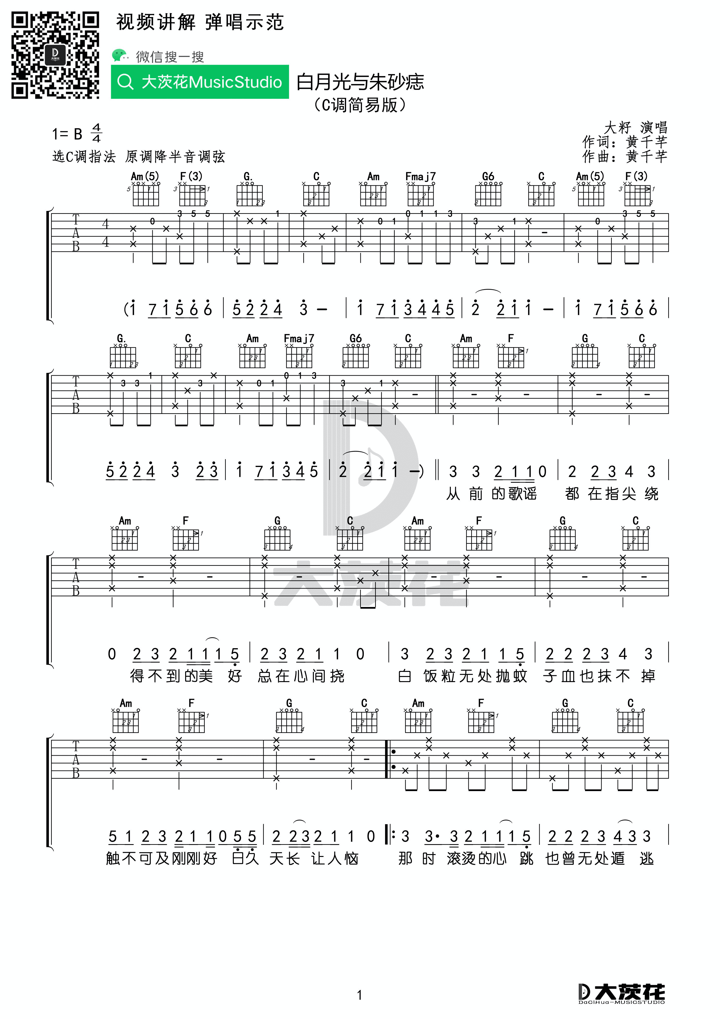 大籽-白月光与朱砂痣(C+G调)吉他谱...