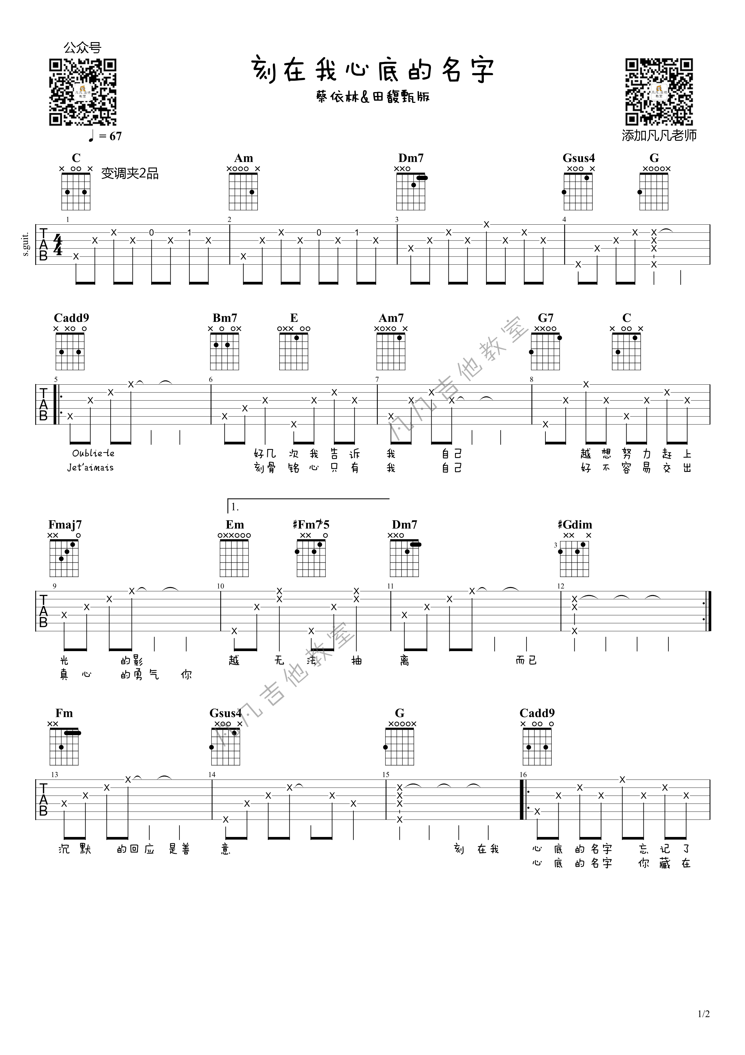 卢广仲《刻在我心底的名字》吉他谱,采用C调指法编配,共有2张高清图谱,免翻页排版设计。...
