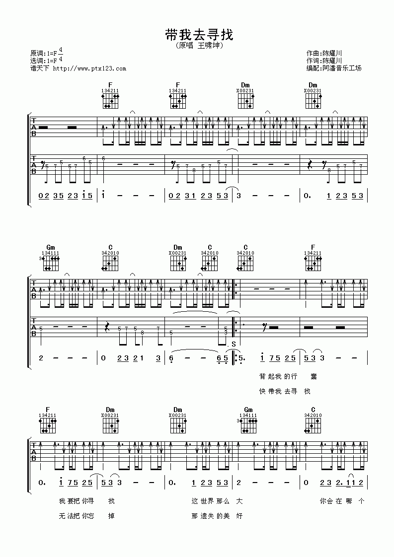 王啸坤《带我去寻找》吉他谱_F调吉他弹唱谱...