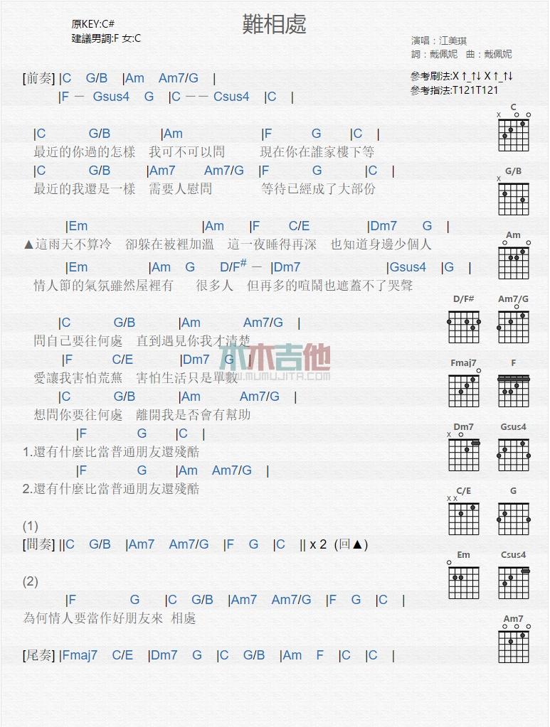 江美琪《难相处》吉他谱_C调弹唱谱...