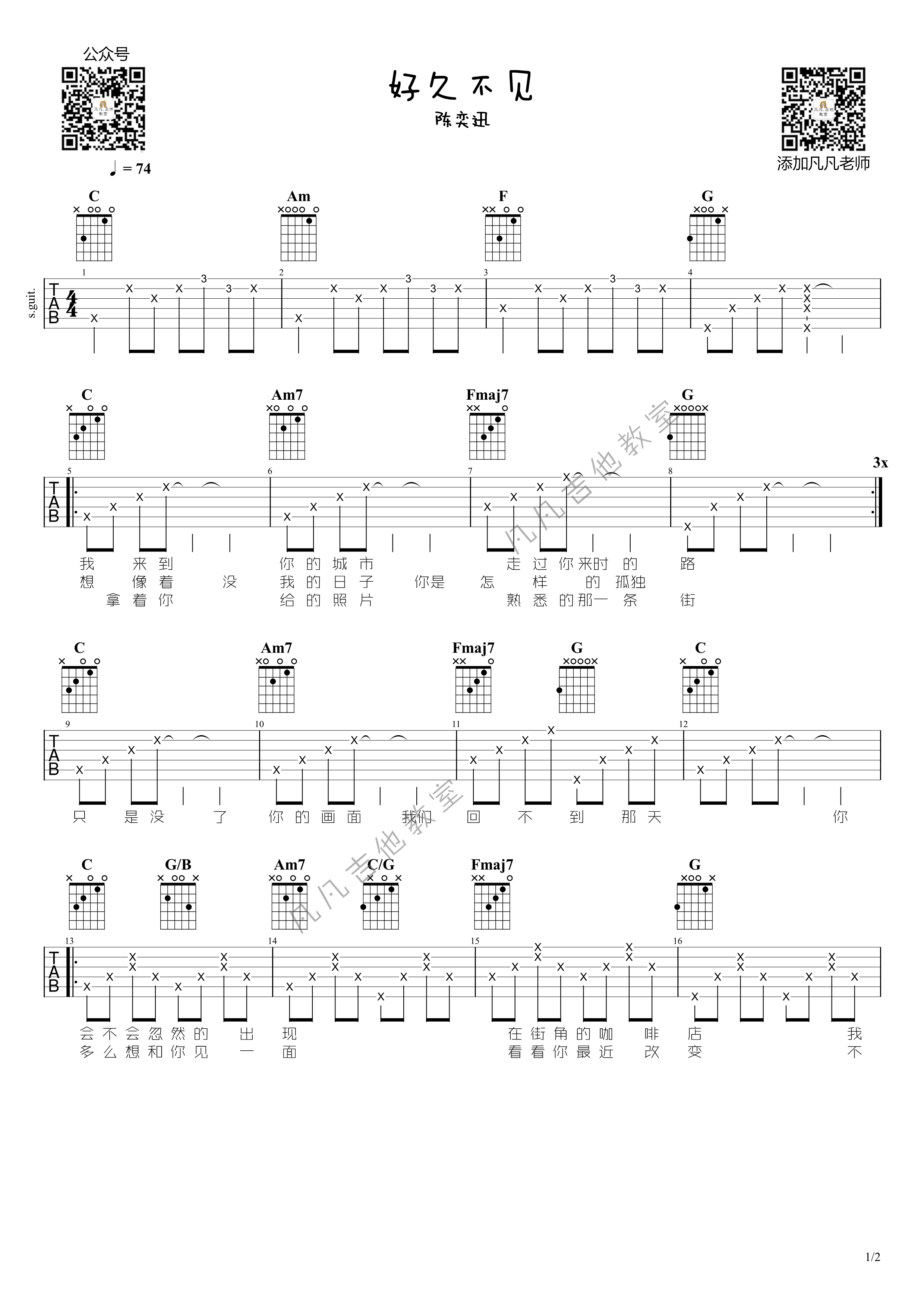 吉他陈奕迅《好久不见》吉他谱-C调弹唱谱