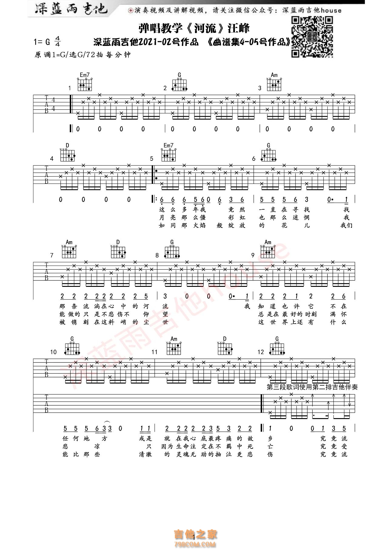 吉他汪峰《河流》吉他谱 -G调弹唱谱