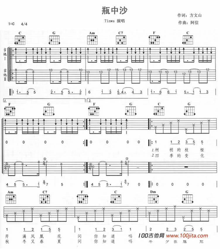 Twins《瓶中沙》吉他谱_C调弹唱谱...
