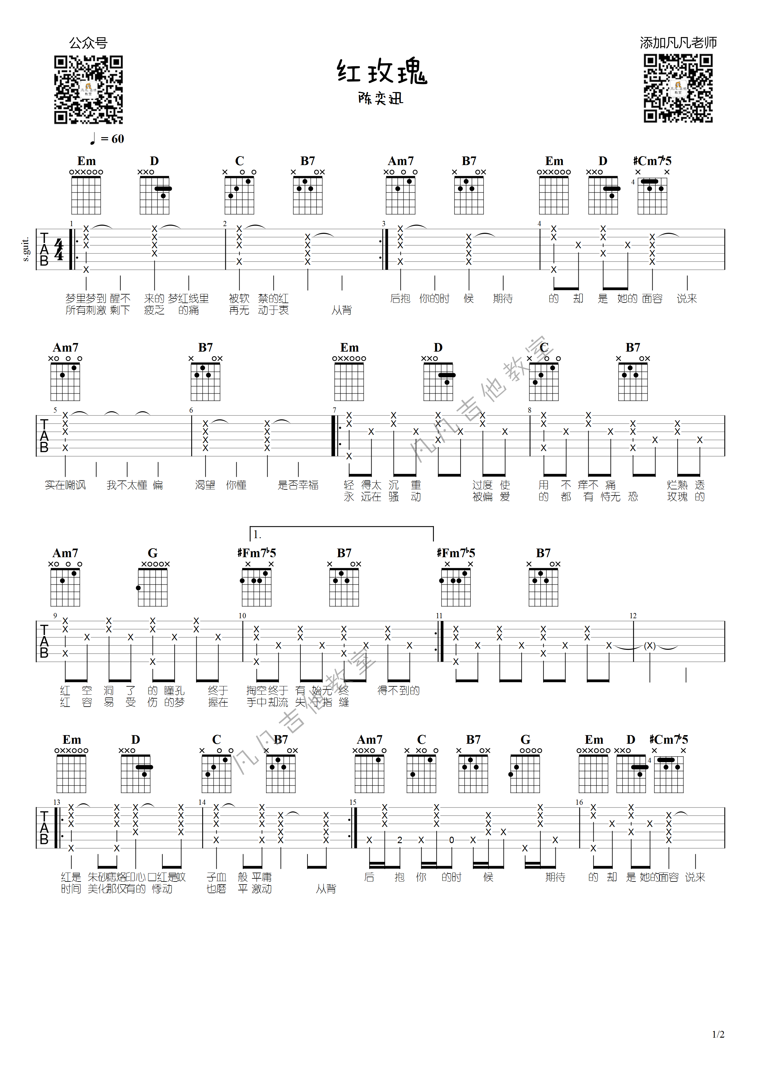 陈奕迅《红玫瑰》吉他谱,采用G调指法编配,共有2张高清图谱,免翻页排版设计。...