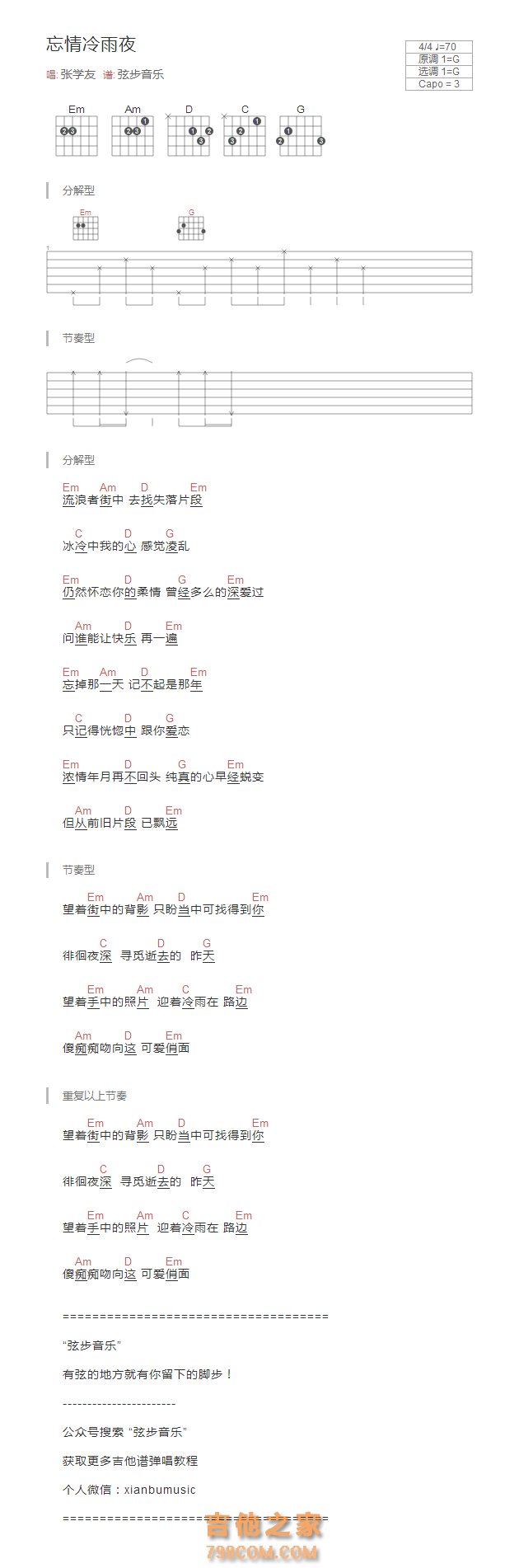 吉他张学友《忘情冷雨夜》吉他谱-G调和弦版