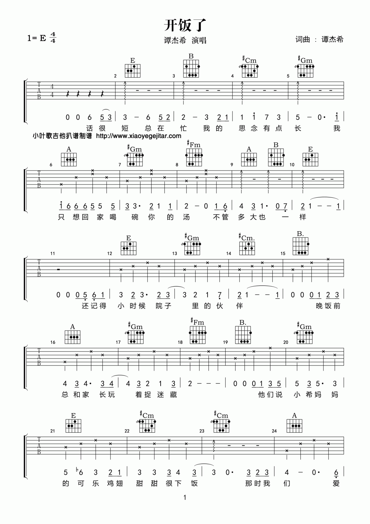 谭佑铭《开饭了》吉他谱_-E调弹唱谱...