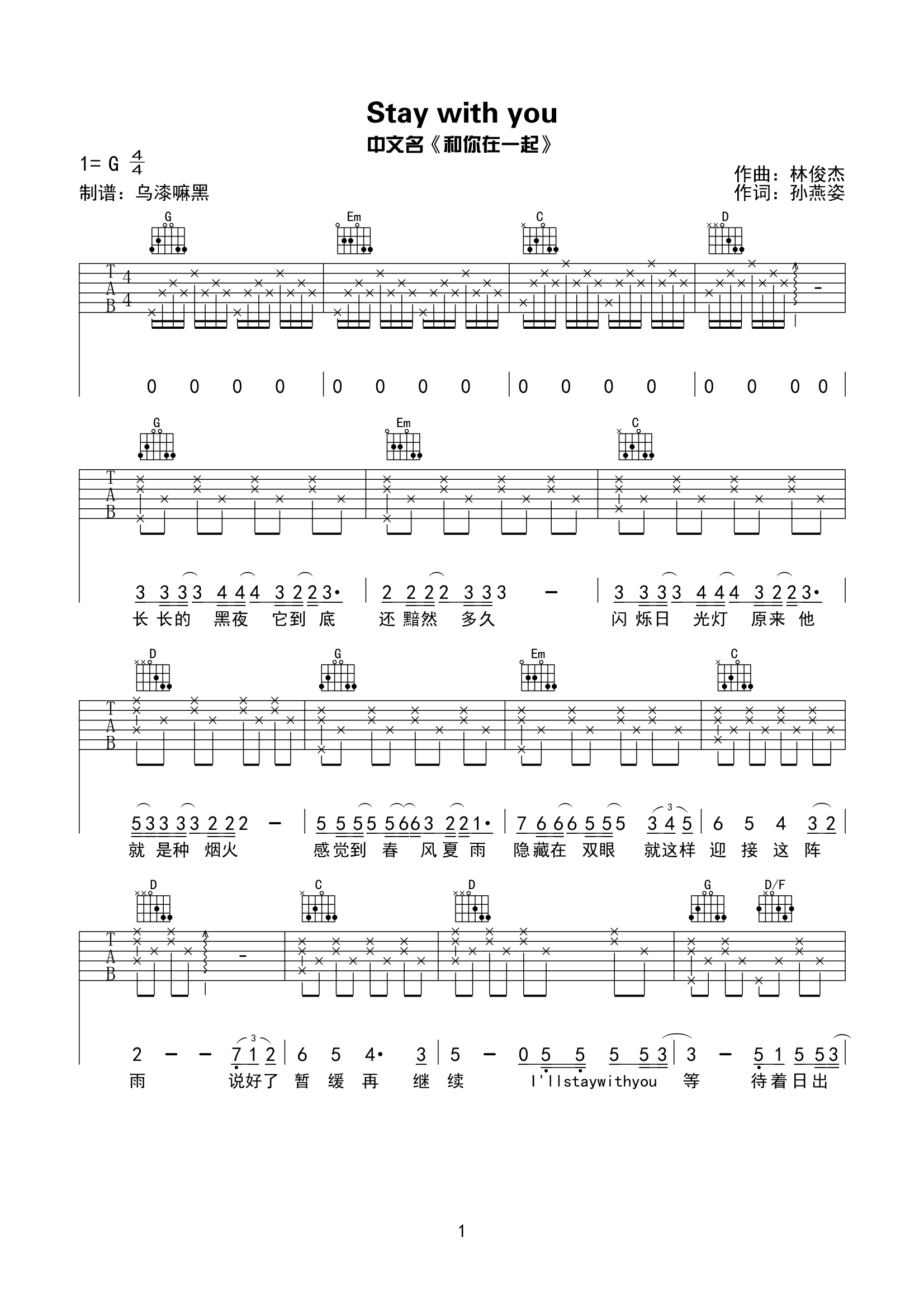 林俊杰/孙燕姿《staywithyou》吉他谱,采用G调指法编配,共有3张高清图谱。...