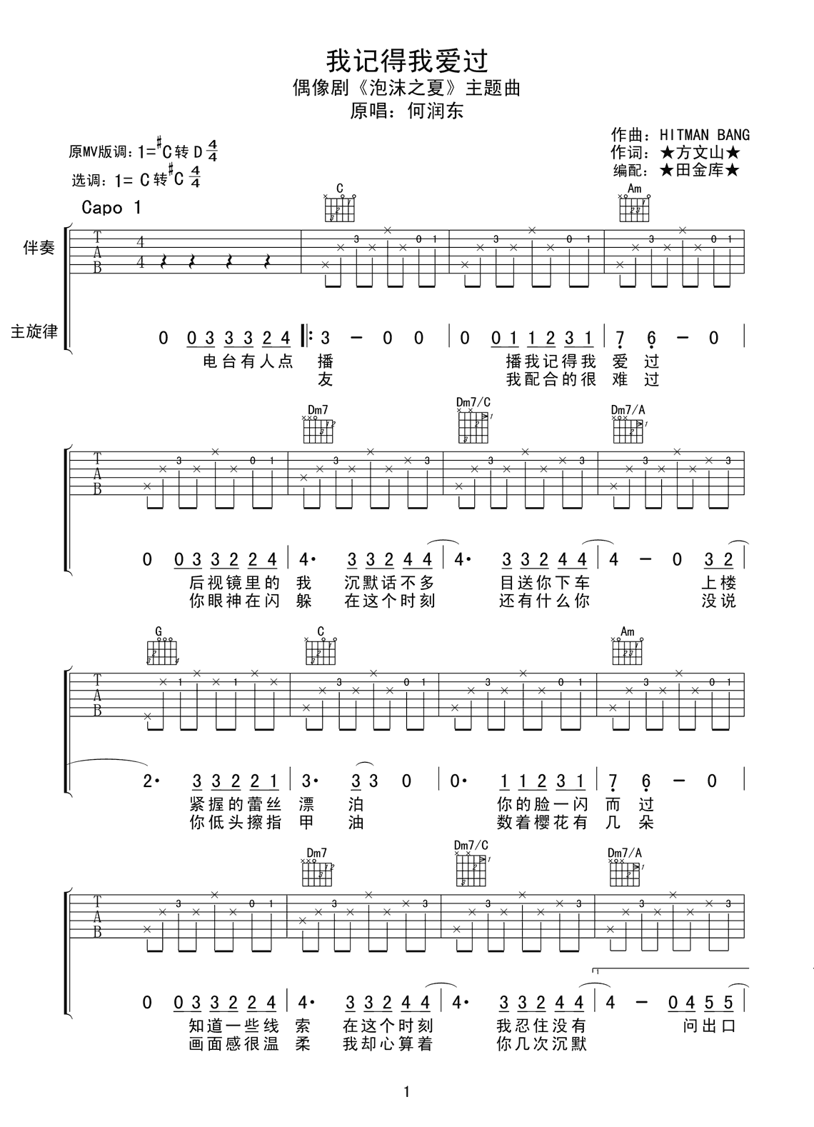 吉他何润东《我记得我爱过》吉他谱-C调弹唱谱