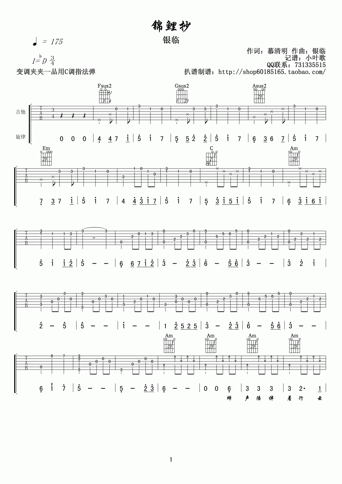 吉他银临《锦鲤抄》吉他谱 -C调弹唱谱