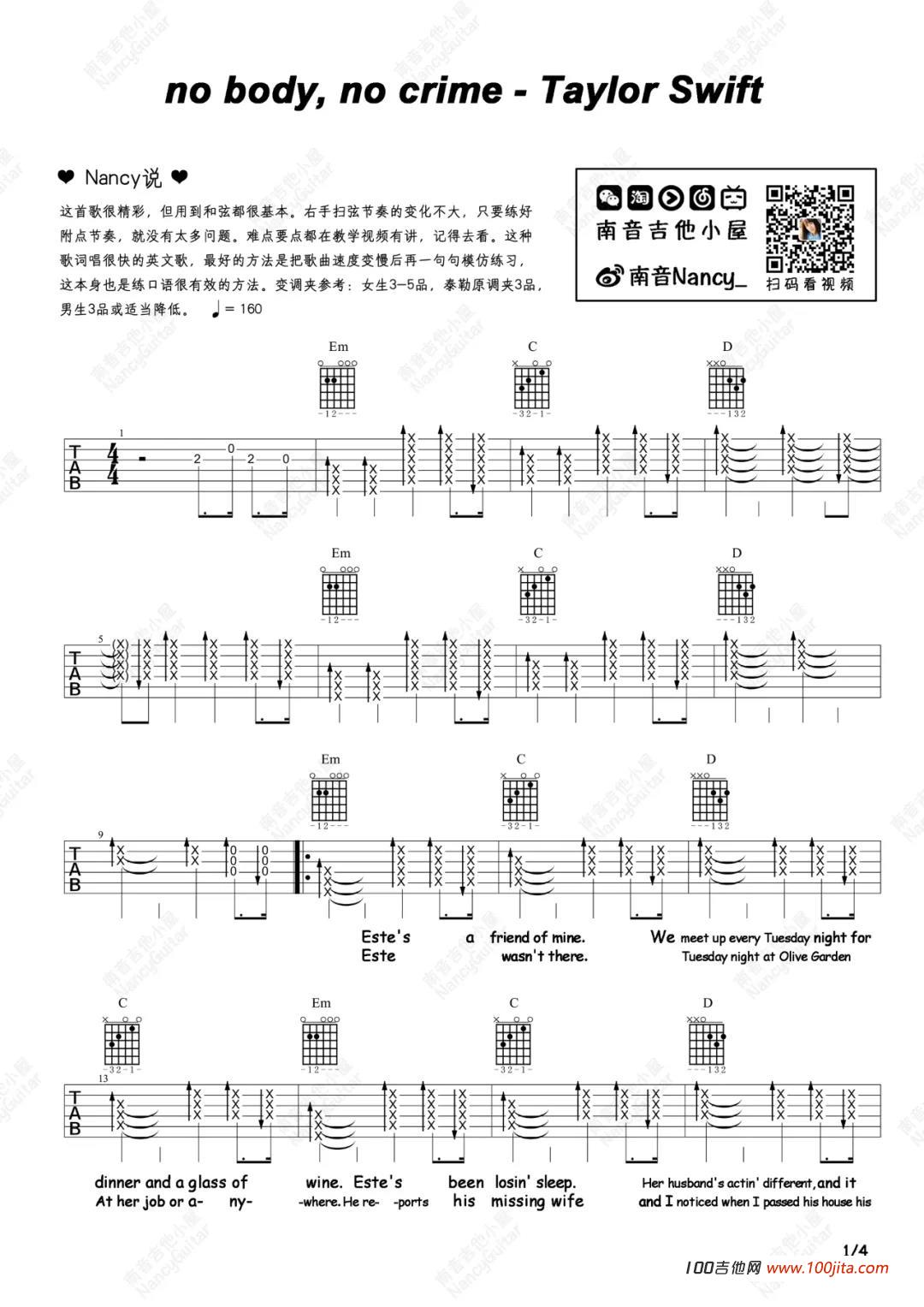 吉他Taylor Swift《no body, no crime》吉他谱_C调弹唱谱