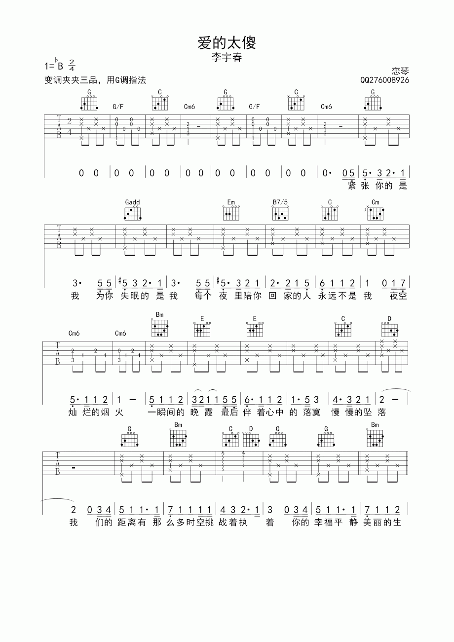李宇春《爱的太傻》吉他谱-G调弹唱谱...