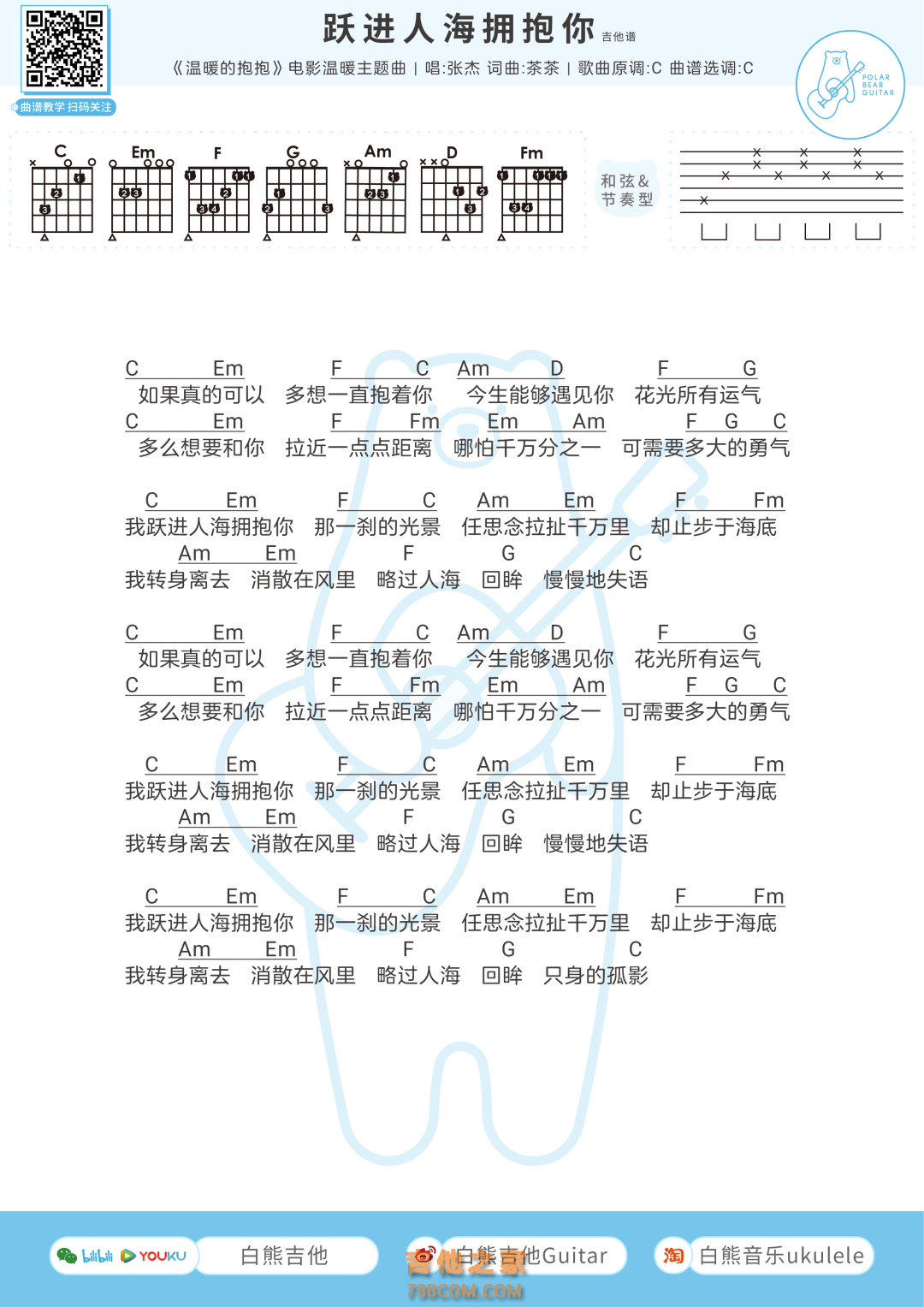 张杰《跃进人海拥抱你》吉他谱-C调弹唱谱...