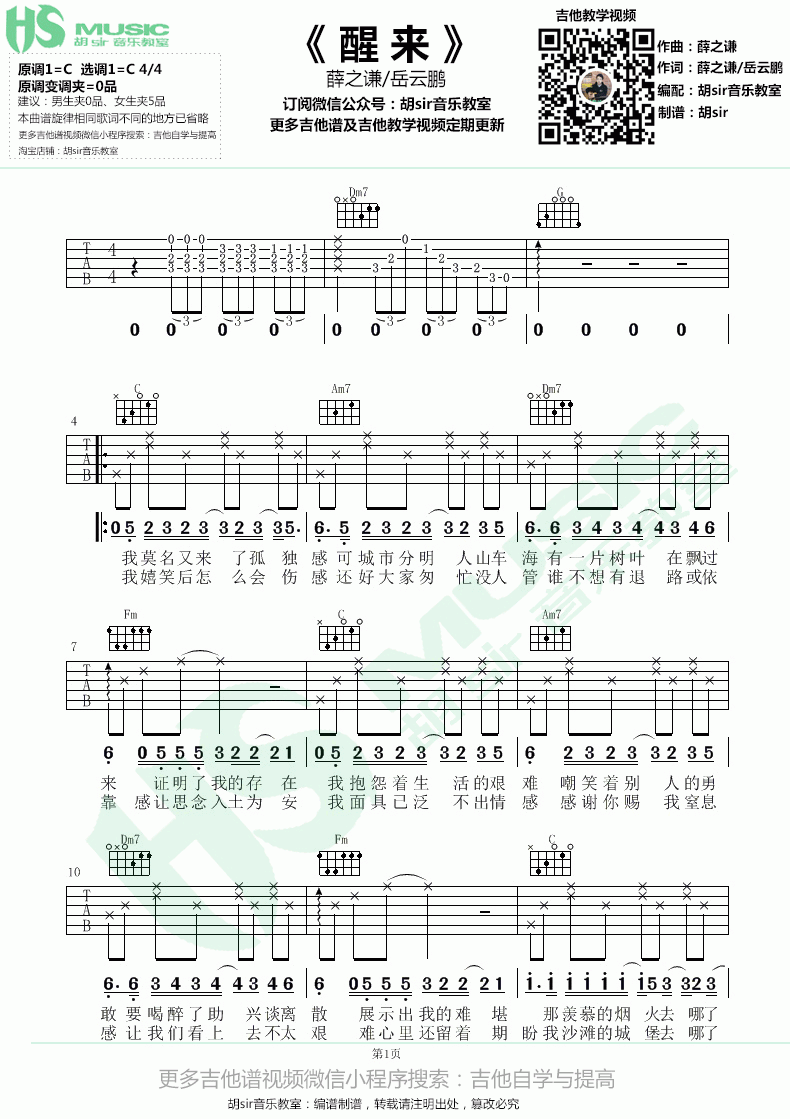 薛之谦、岳云鹏《醒来》吉他谱_C调六线弹唱谱...