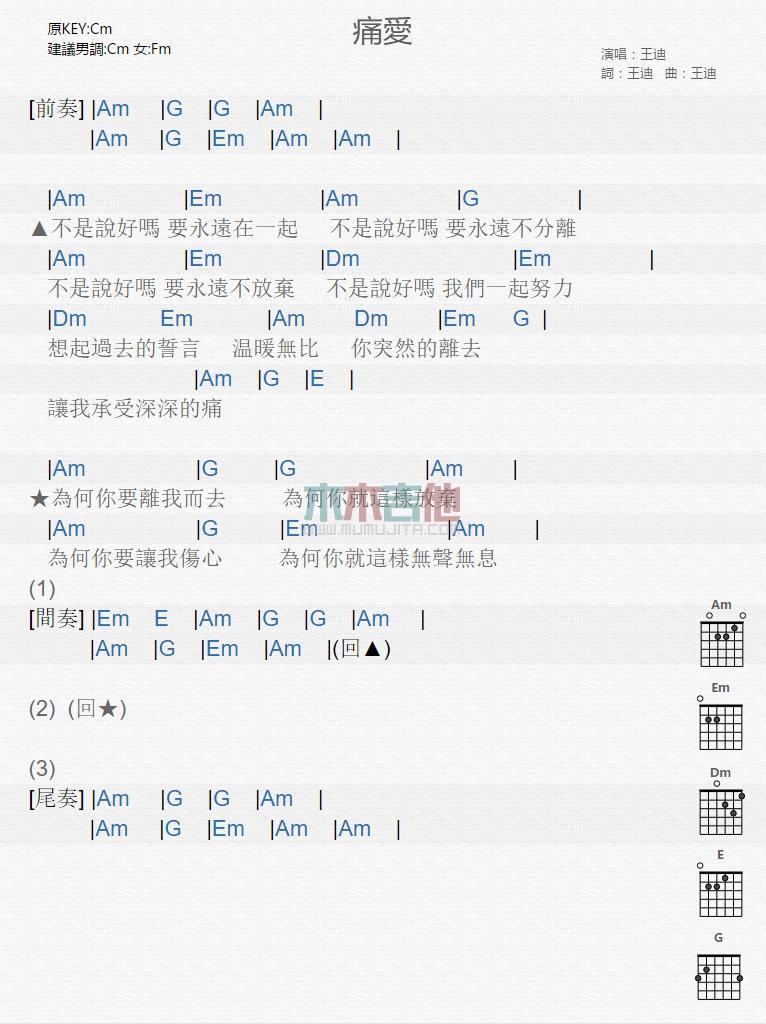王迪《痛爱》吉他谱_C调和弦弹唱谱...