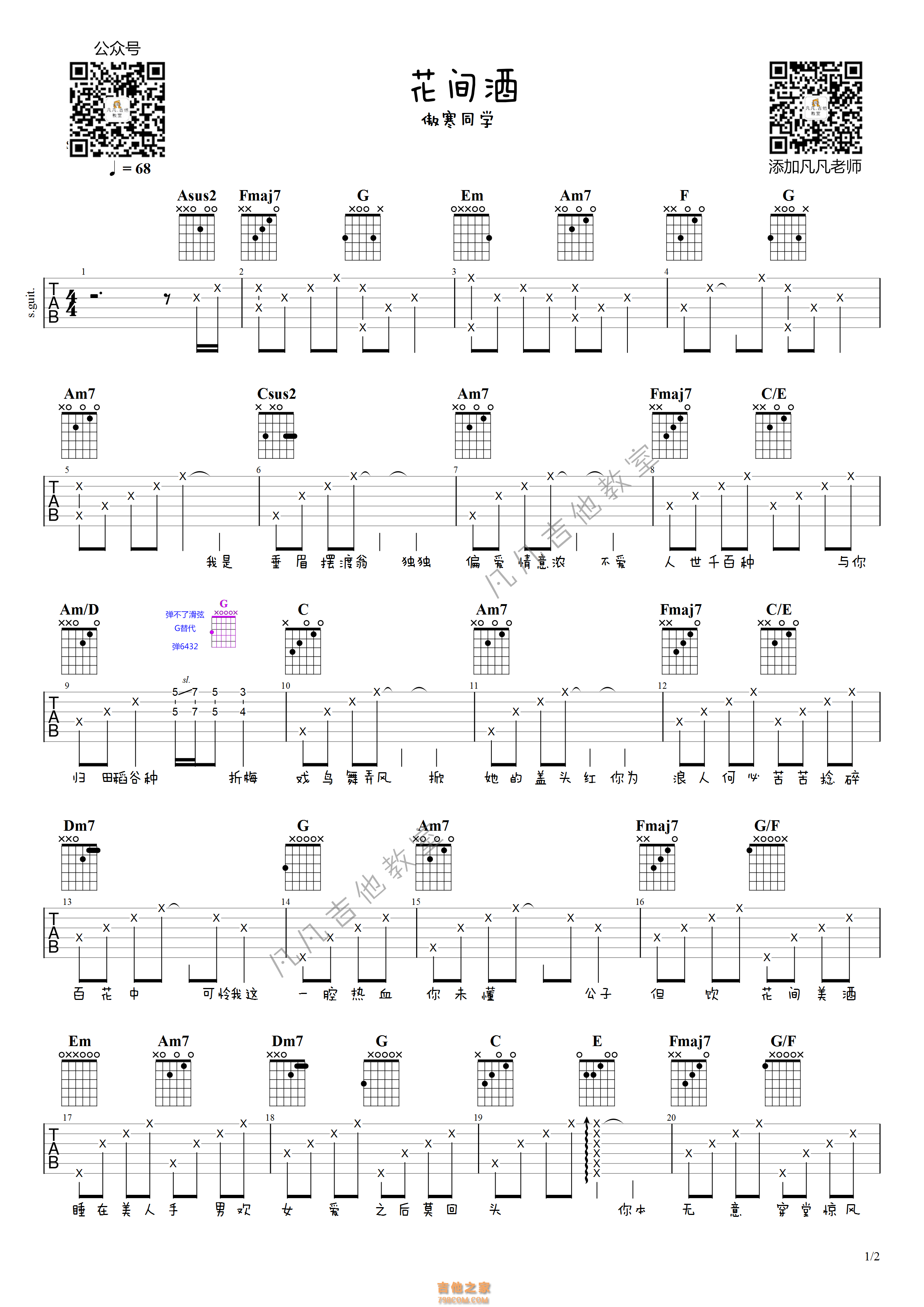 吉他傲寒同学《花间酒》吉他谱-C调弹唱谱