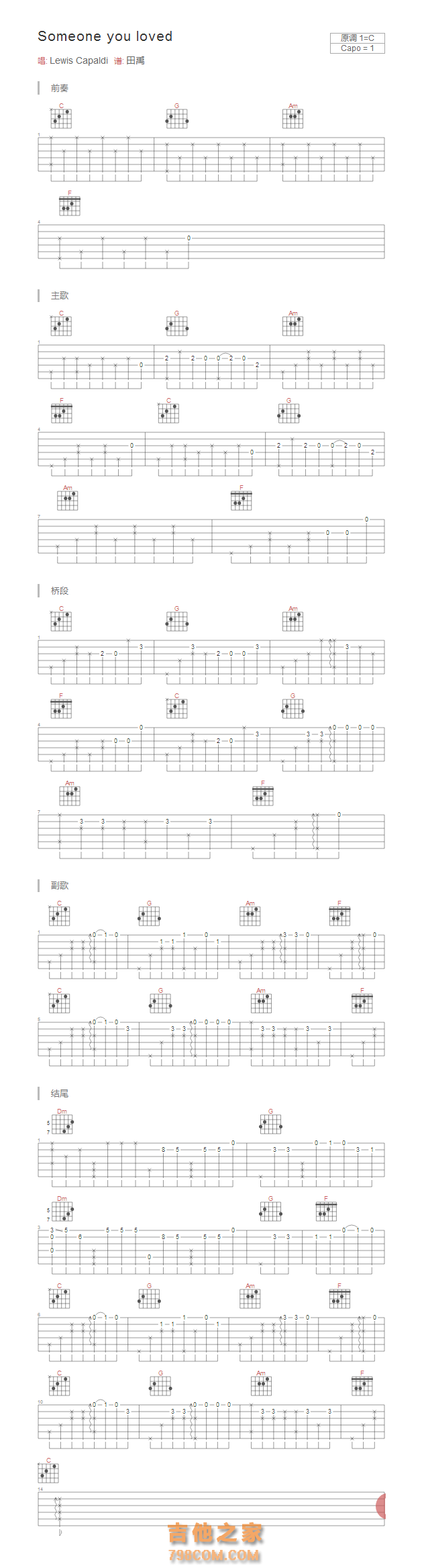 吉他 Lewis Capaldi《Someone you loved》吉他谱-C调和弦版