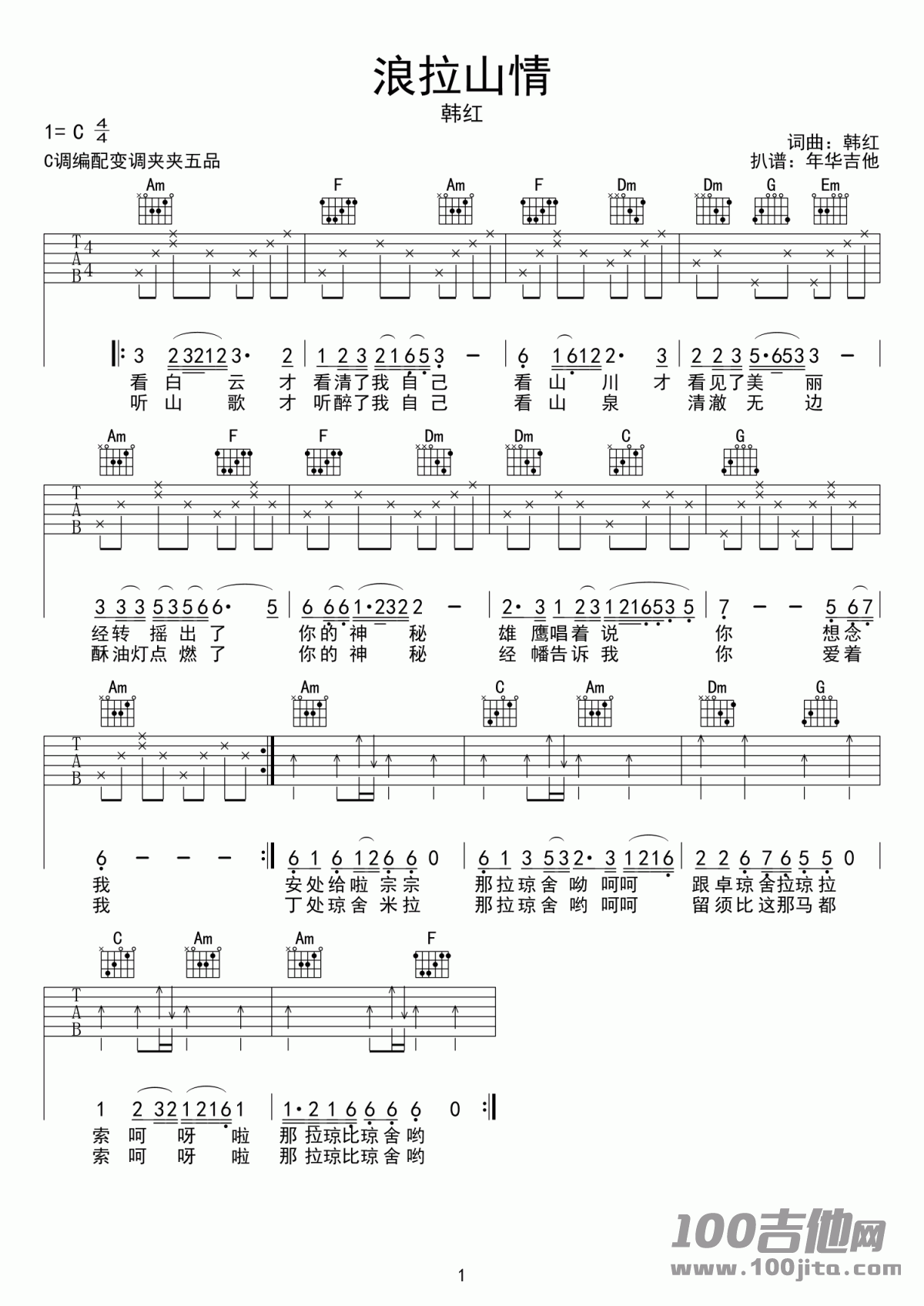 吉他妙子/韩红《浪拉山情》吉他谱_C调弹唱谱