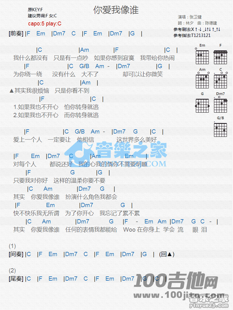 吉他张卫健《你爱我像谁》吉他谱_C调和弦弹唱谱