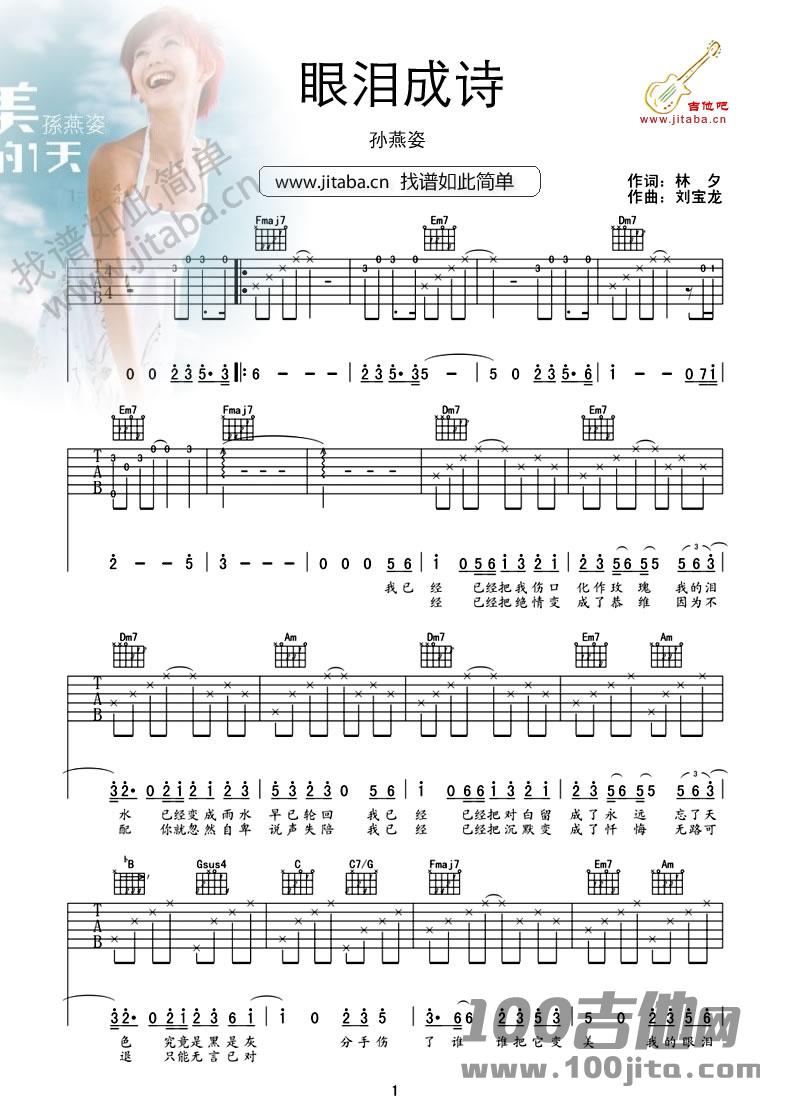 吉他孙燕姿《眼泪成诗》吉他谱_C调弹唱谱