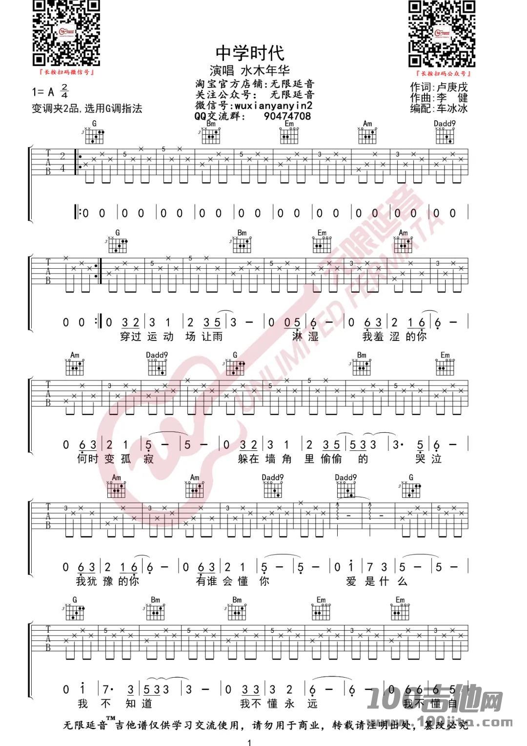 水木年华《中学时代》吉他谱_G调吉他六线谱...