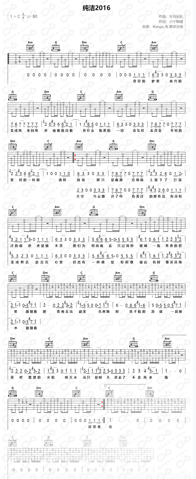 吉他muma木马《纯洁2016》吉他谱-C调六线弹唱谱