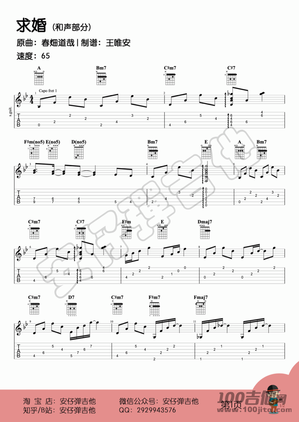 吉他春畑道哉《求婚》指弹吉他谱_降B调求婚独奏谱