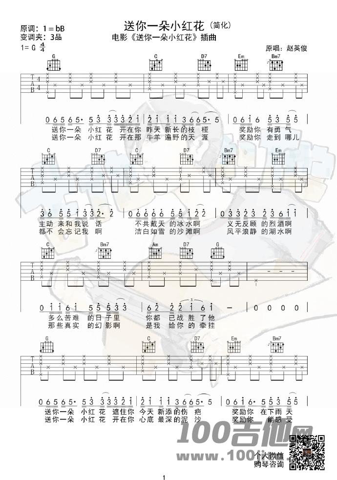 赵英俊《送你一朵小红花》吉他谱_G调六线弹唱谱...