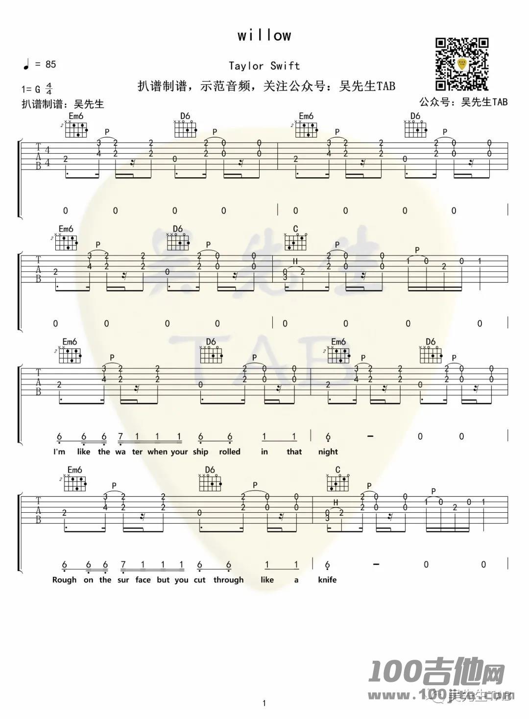 霉霉TaylorSwift《willow》吉他谱_G调六线弹唱谱...