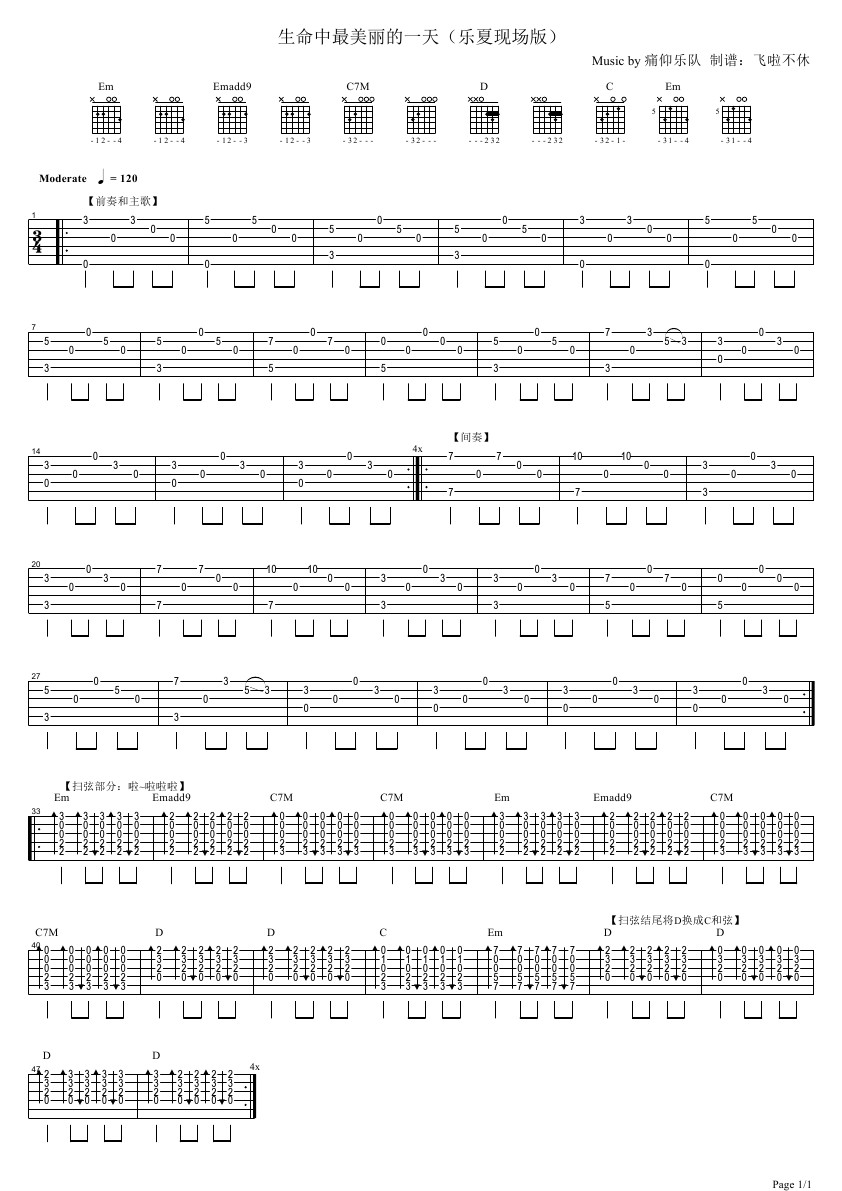 痛苦的信仰《生命中最美丽的一天》吉他独奏谱_C调指弹谱...