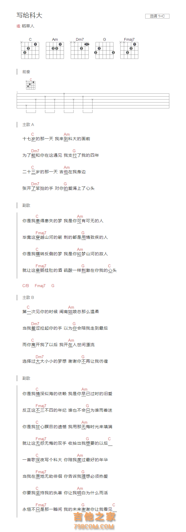 稻草人《写给科大》吉他谱-C调和弦弹唱版...