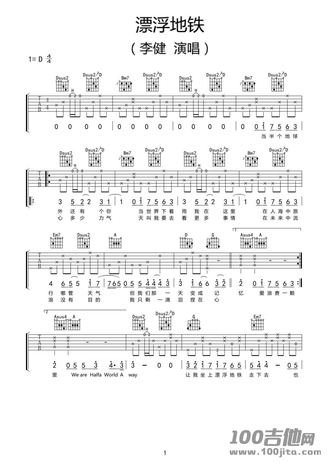 李健《漂浮地铁》吉他谱_D调六线弹唱谱...