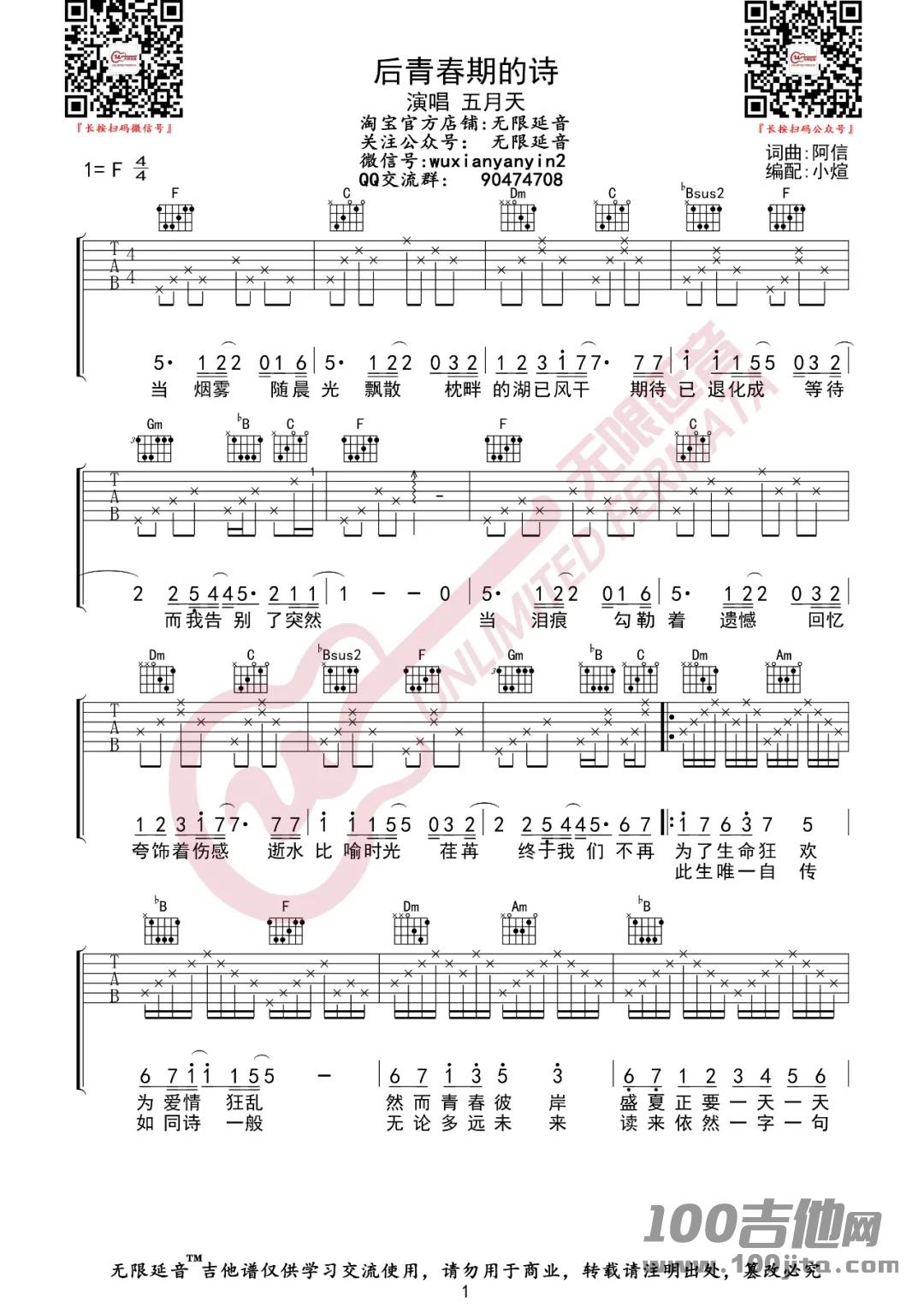 吉他五月天《后青春期的诗》吉他谱-F调弹唱六线谱