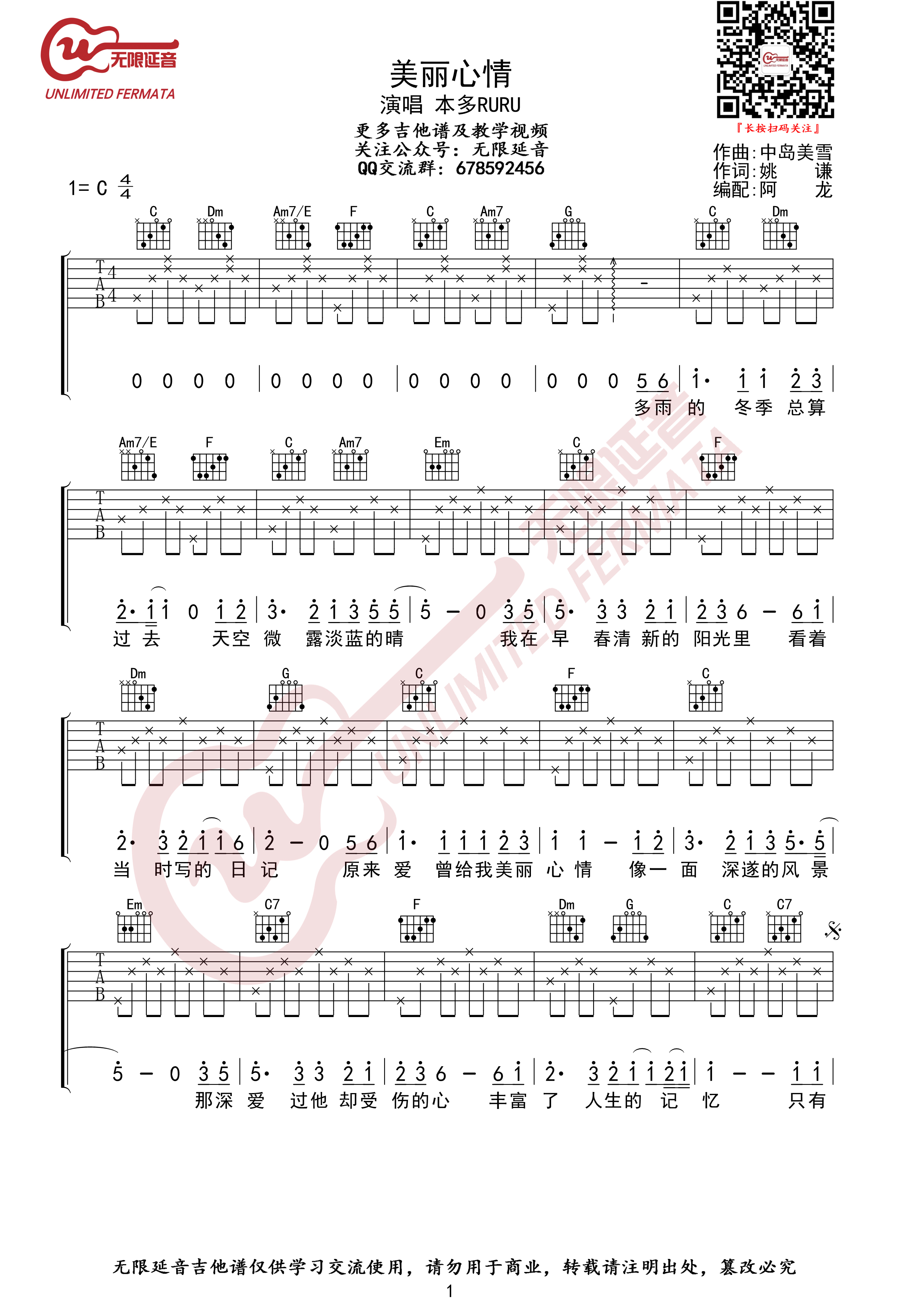 本多RURU《美丽心情》吉他谱_C调弹唱谱...