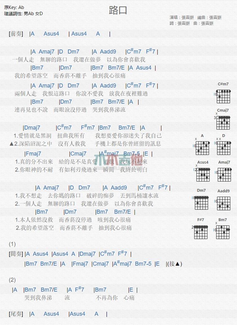 吉他张震岳《路口》吉他谱_A调和弦弹唱谱