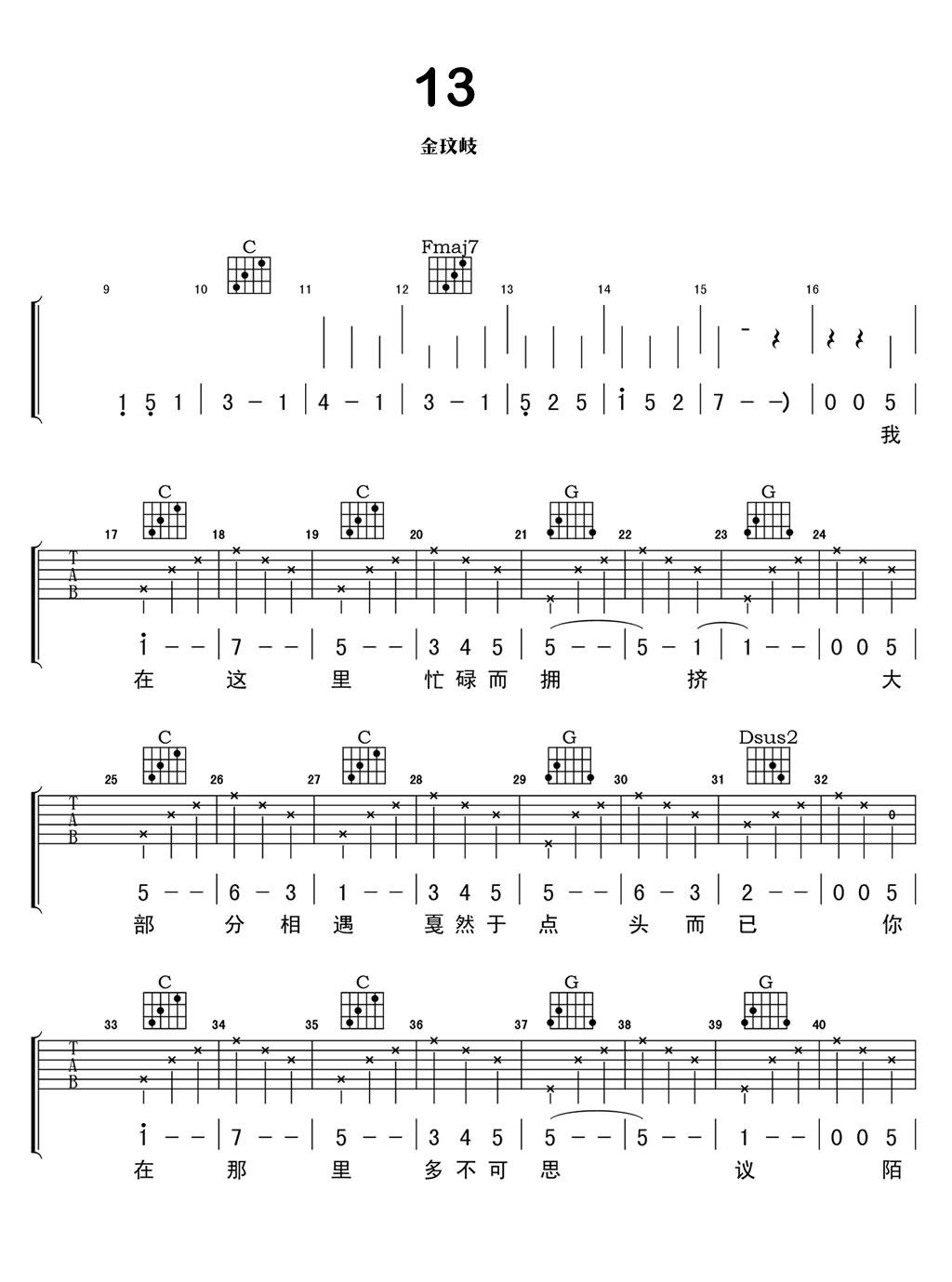吉他金玟岐《13》吉他谱_C调弹唱谱