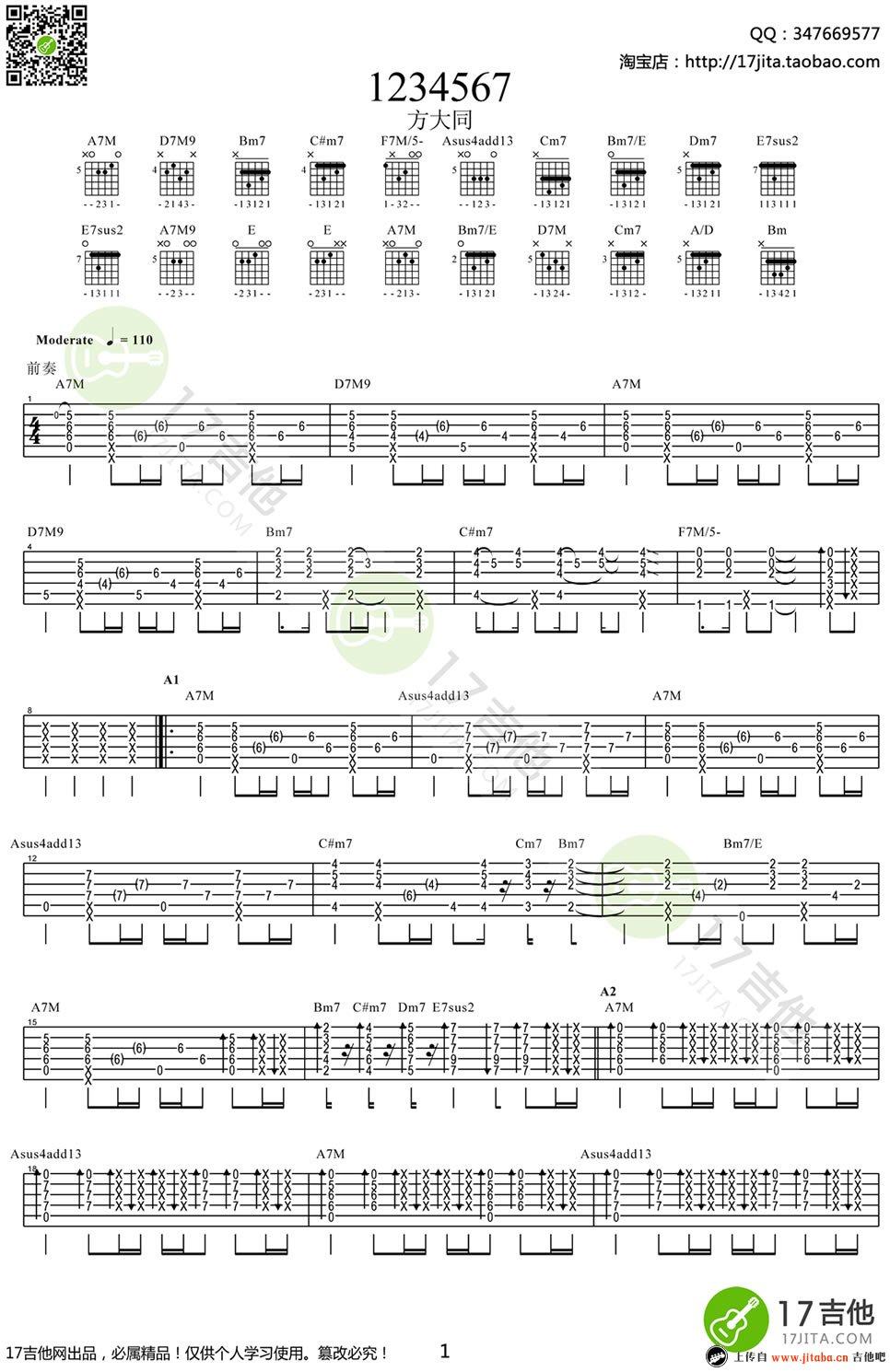 吉他方大同《1234567》指弹吉他谱