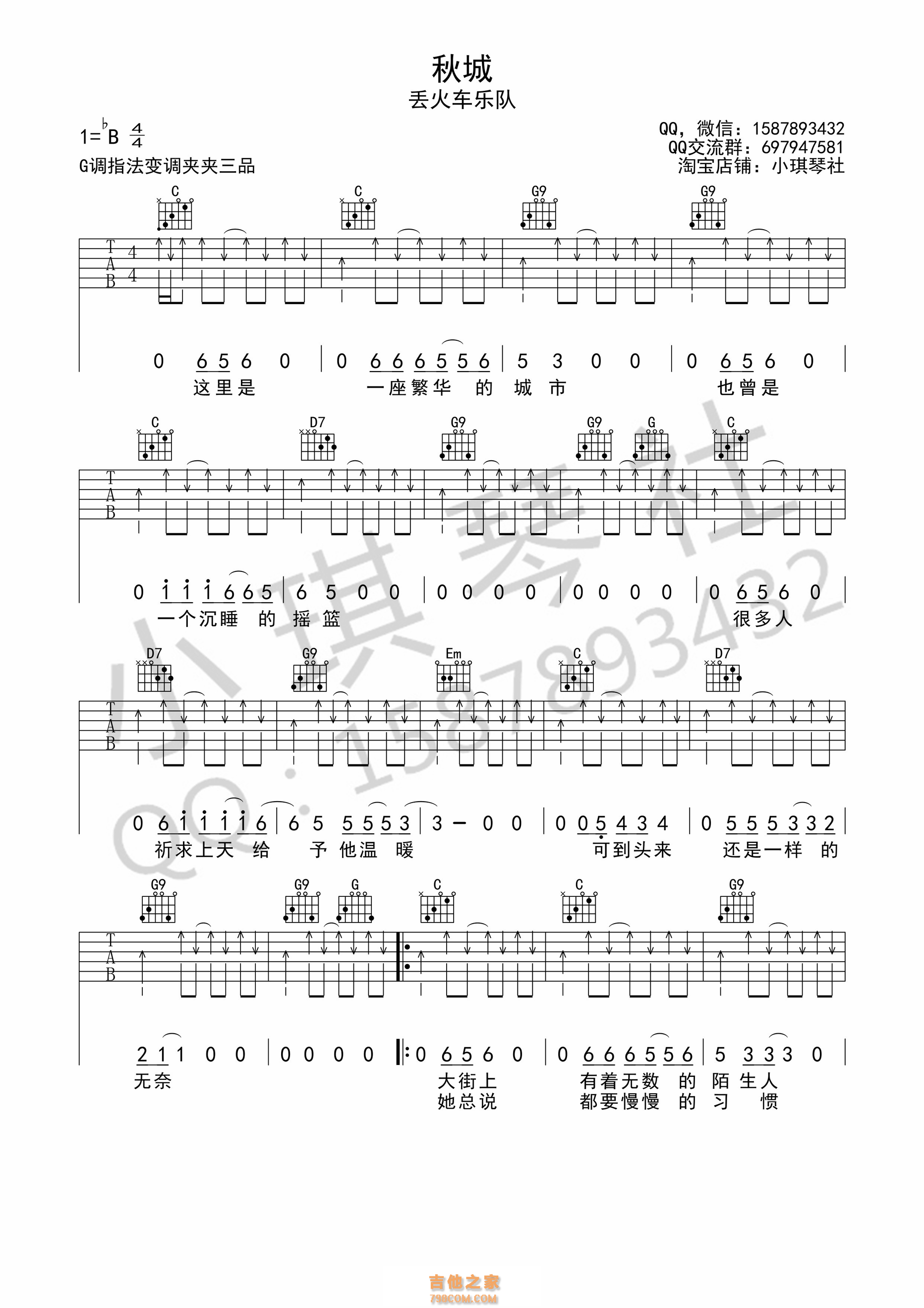 吉他丢火车乐队《秋城》吉他谱- G调弹唱六线谱