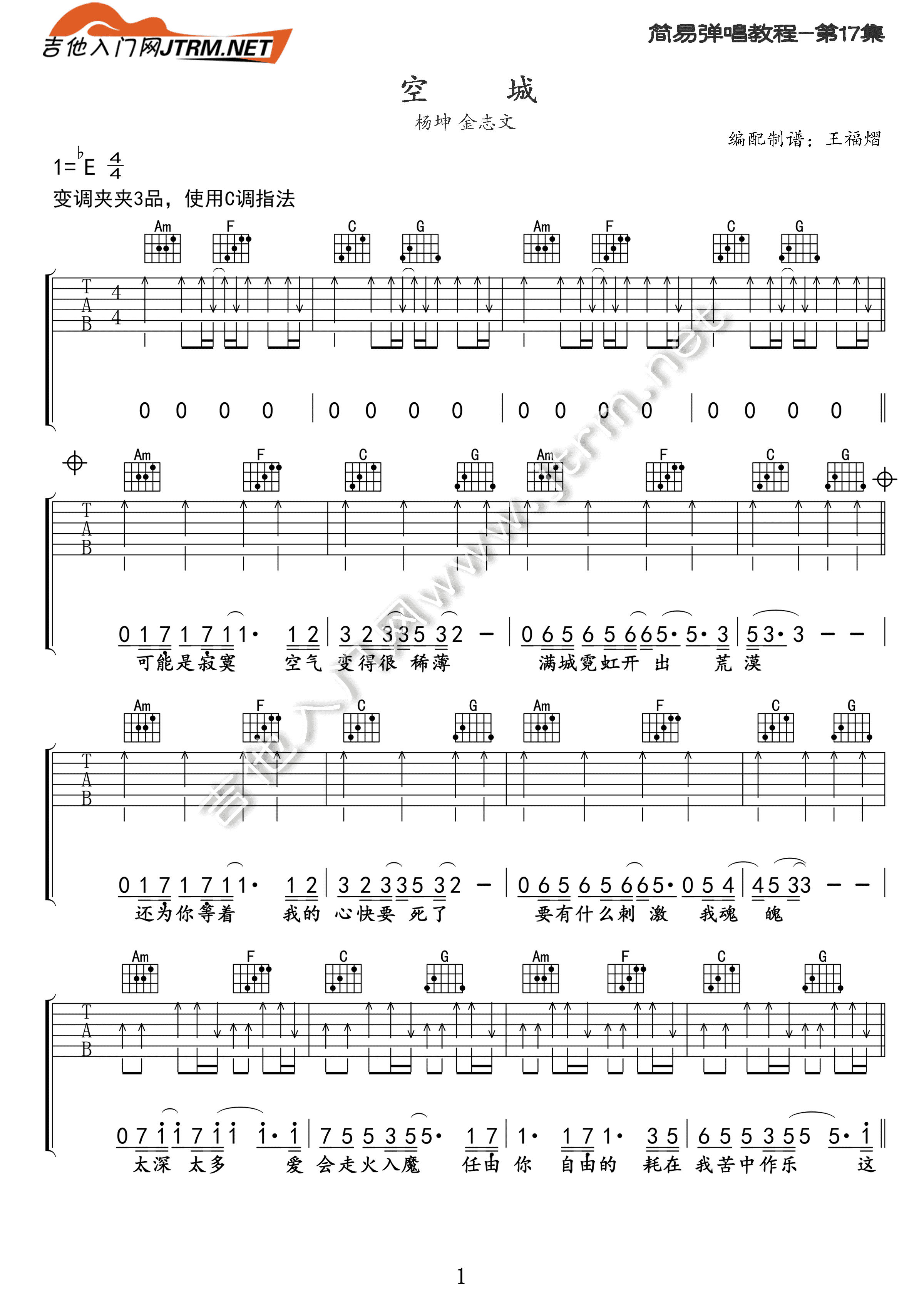 吉他 杨坤《空城》吉他谱- C调吉他谱弹唱六线谱