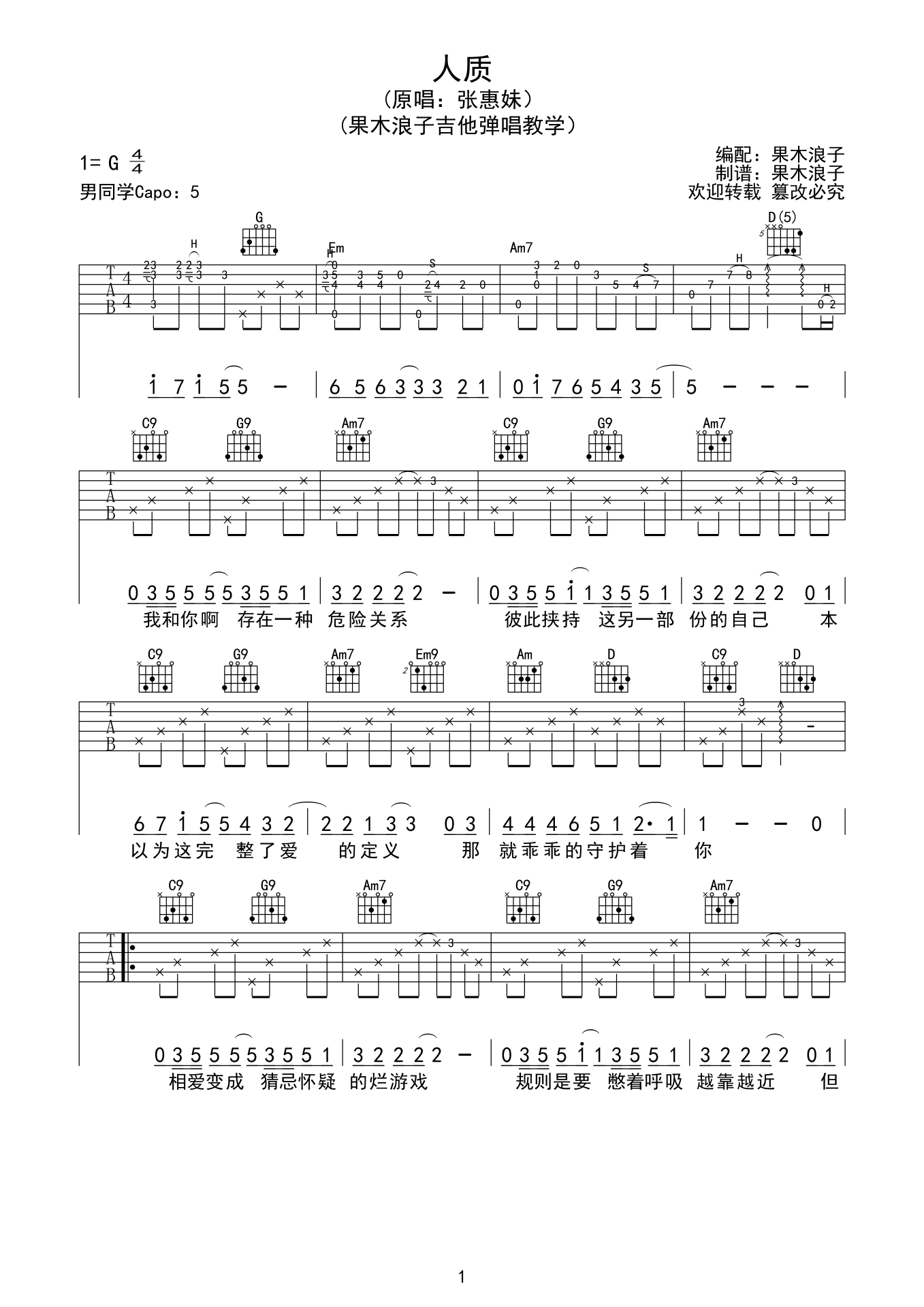 吉他张惠妹《人质》吉他谱-G调吉他谱弹唱六线谱