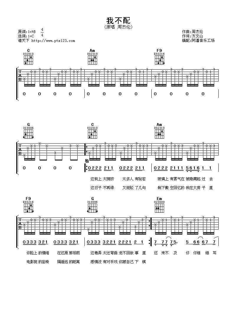 周杰伦《我不配》吉他谱-C调弹唱六线谱...