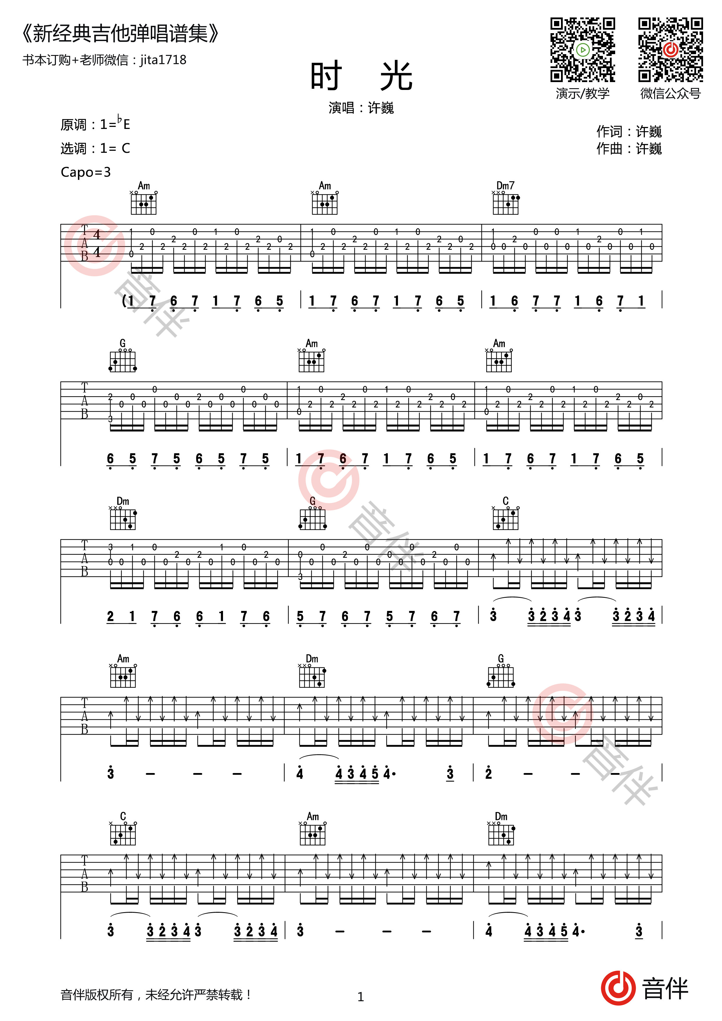 吉他许巍 《时光》吉他谱 -C调弹唱谱