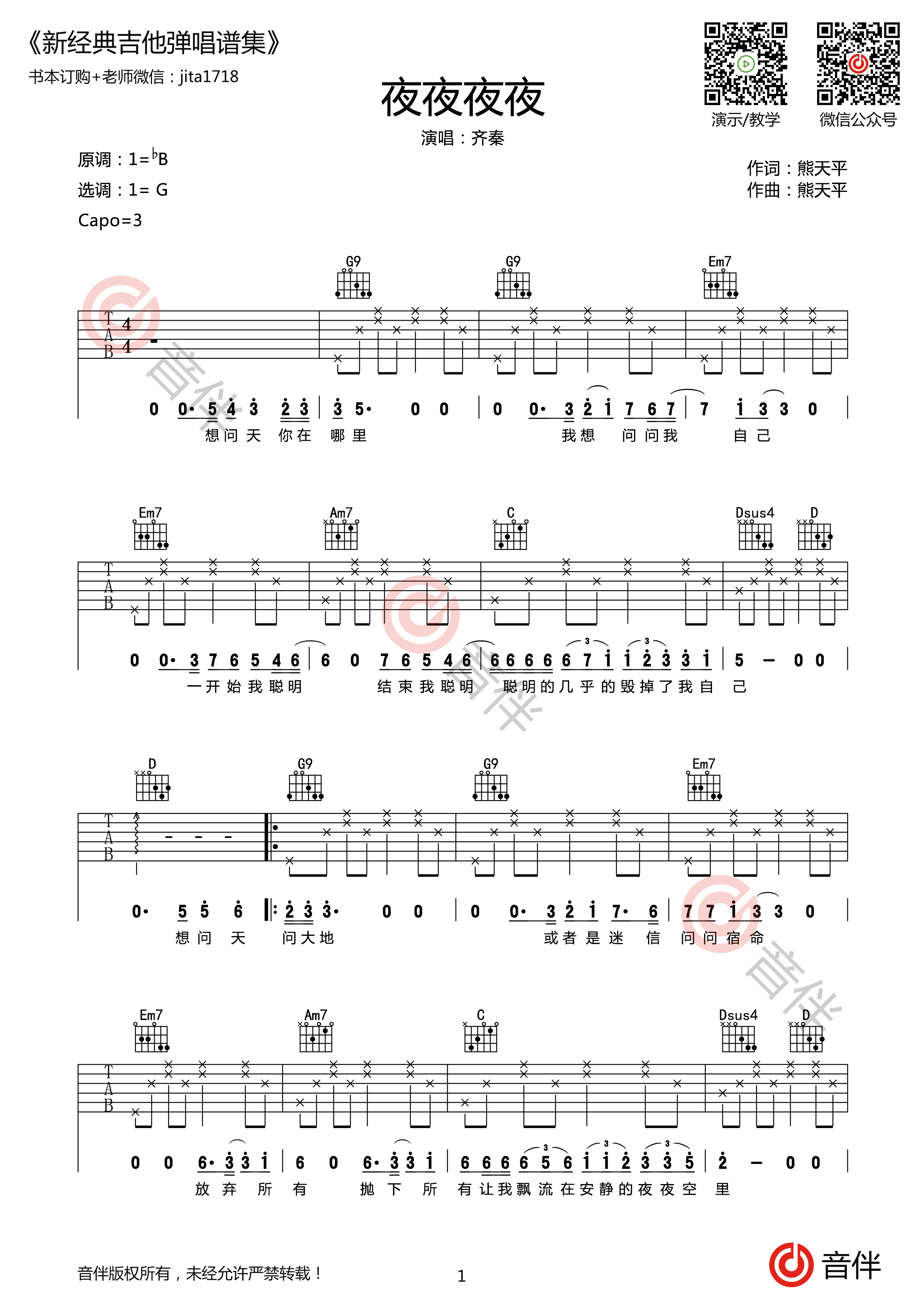吉他齐秦 《夜夜夜夜》吉他谱 -G调弹唱谱