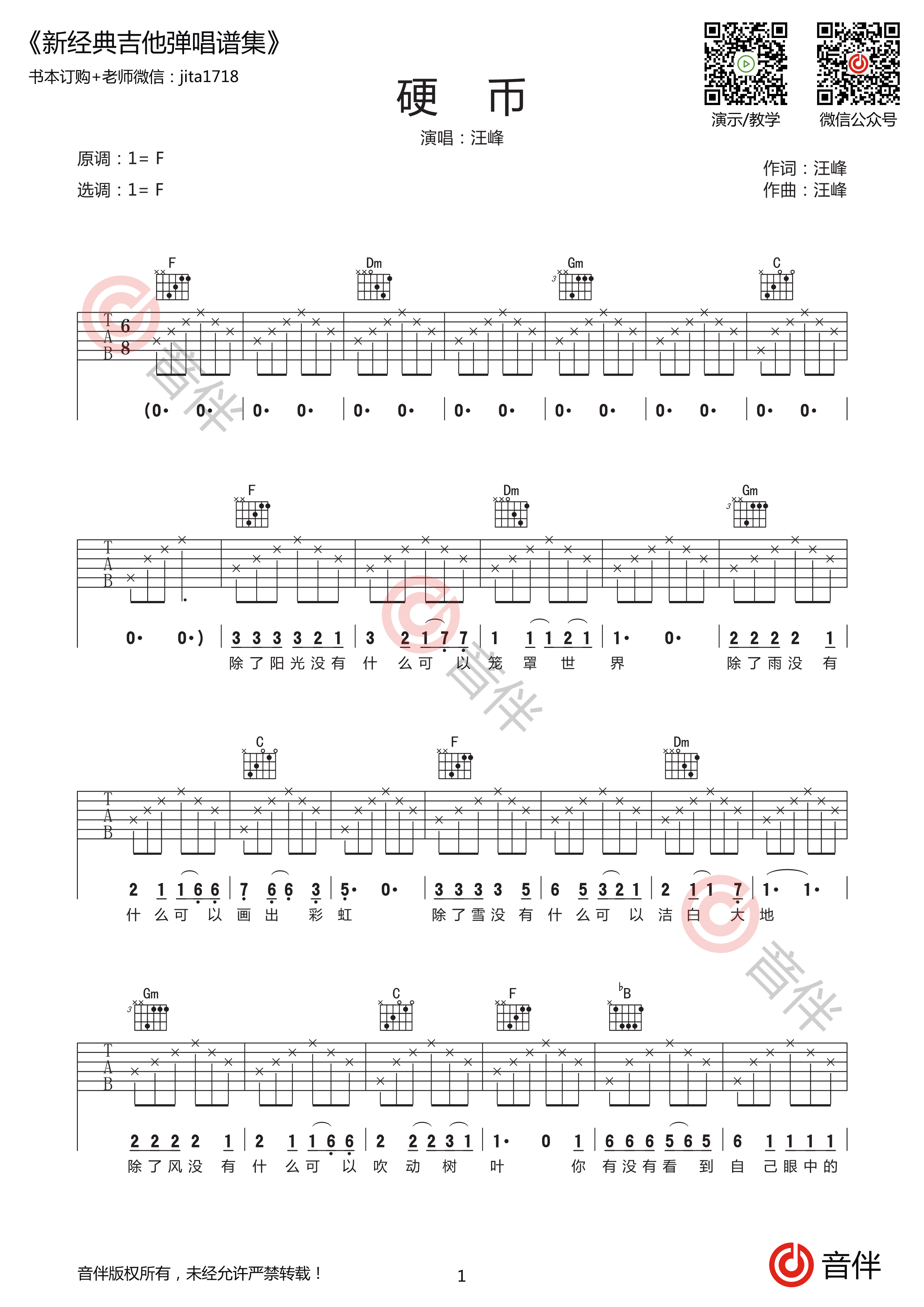 吉他汪峰 《硬币》吉他谱 -F调弹唱谱